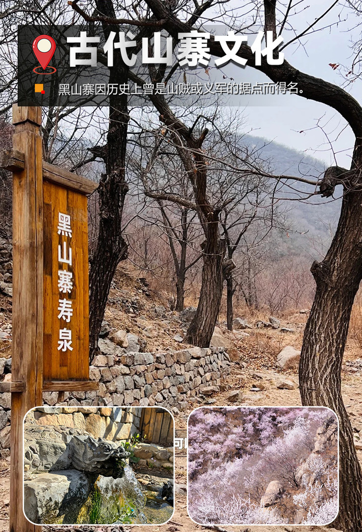 黑山寨因历史上曾是山贼或义军的据点而得名,充满了神秘色彩和传奇故事。福泉以其清澈甘甜的泉水和悠久的历史传说闻名,泉水常年不涸,被誉为“神泉”。相传饮用此泉水可延年益寿,因此吸引了众多游客前来品尝。