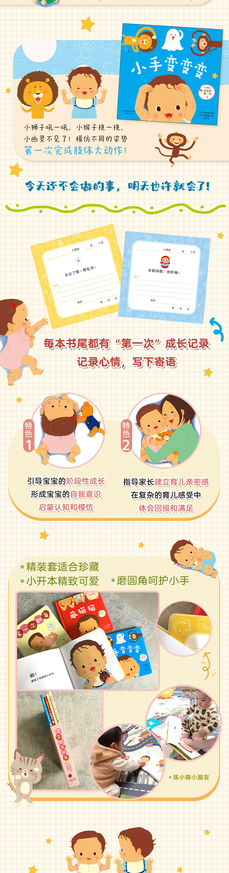 鼓励宝宝次翻身、见证宝宝颗乳牙,引导宝宝次用小手玩游戏,和宝宝次亲子共读……宝宝的本成长珍藏纪念册,给新手爸妈的甜蜜育儿指南。享受和珍藏与宝宝相处的最初时光。书尾设计寄语卡,记录宝宝次翻身、长牙、小手动作等有纪念意义的日期,写上对宝宝说的话,还可以附上宝宝的可爱照片!