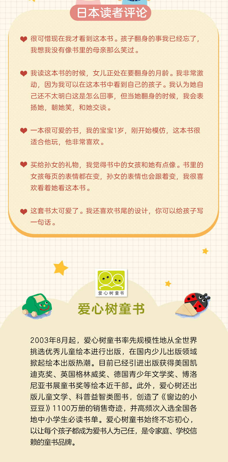 我读这本书的时候,女儿正处在要翻身的月龄。我非常激动,因为我可以在这本书中看到自己的孩子。我认为她自己还不太明白这是怎么回事,但当她翻身的时候,我会表扬她,朝她笑,和她交谈。 ——日本读者