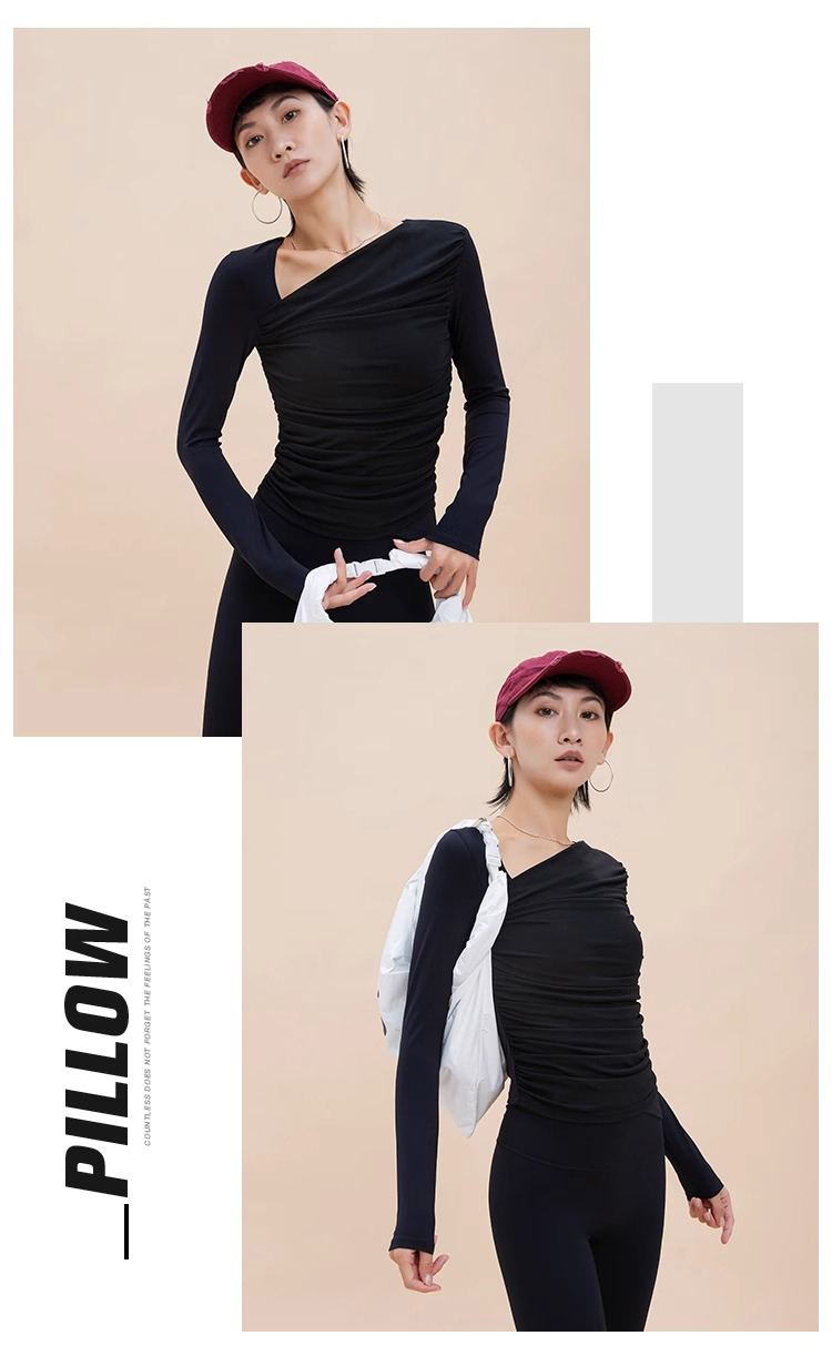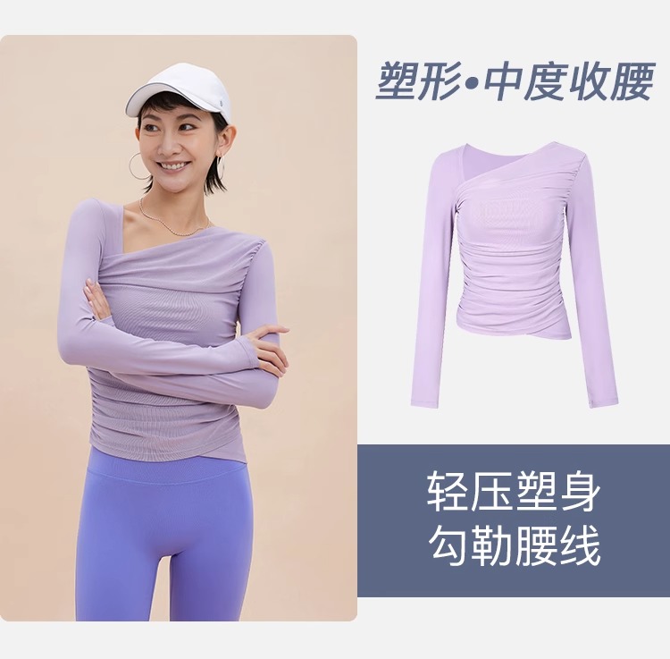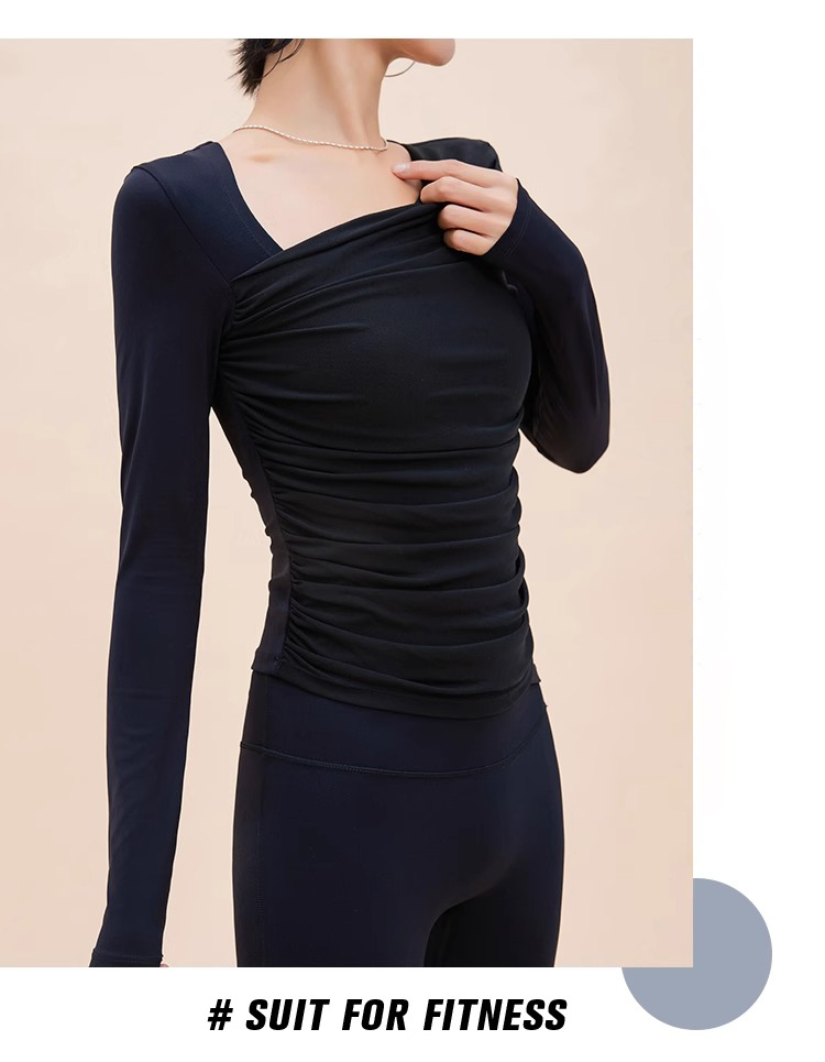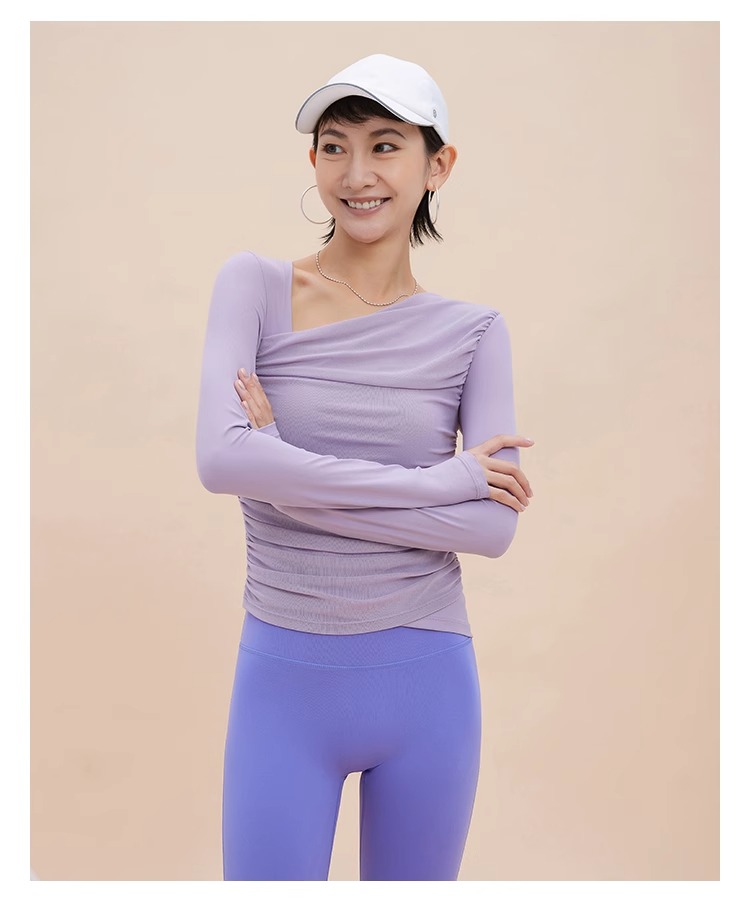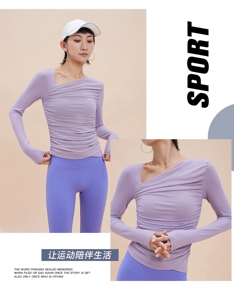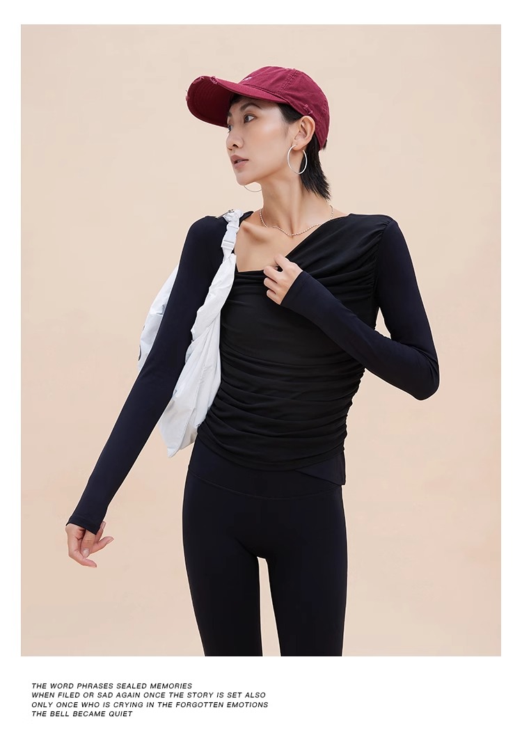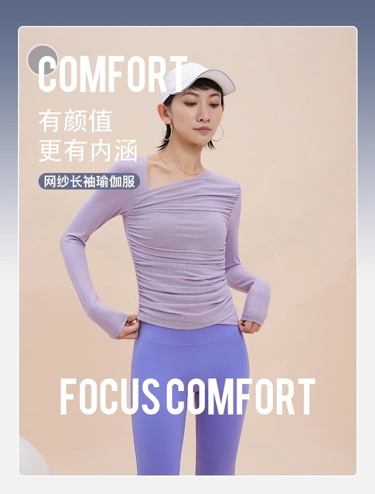 【限时秒】YOGACODE【火树银花系列】2024 欧美斜领瑜伽长袖T恤女网纱拼接带胸垫运动上衣DWTS124017