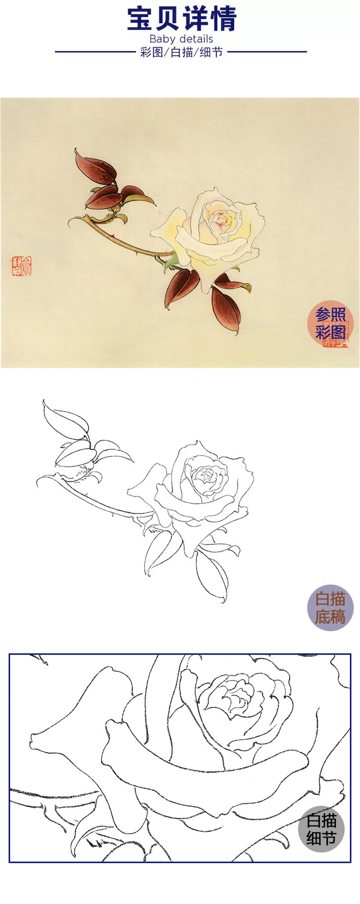 俞致贞工笔花鸟白描底稿-花卉月季花-斗方小品册页-JV58