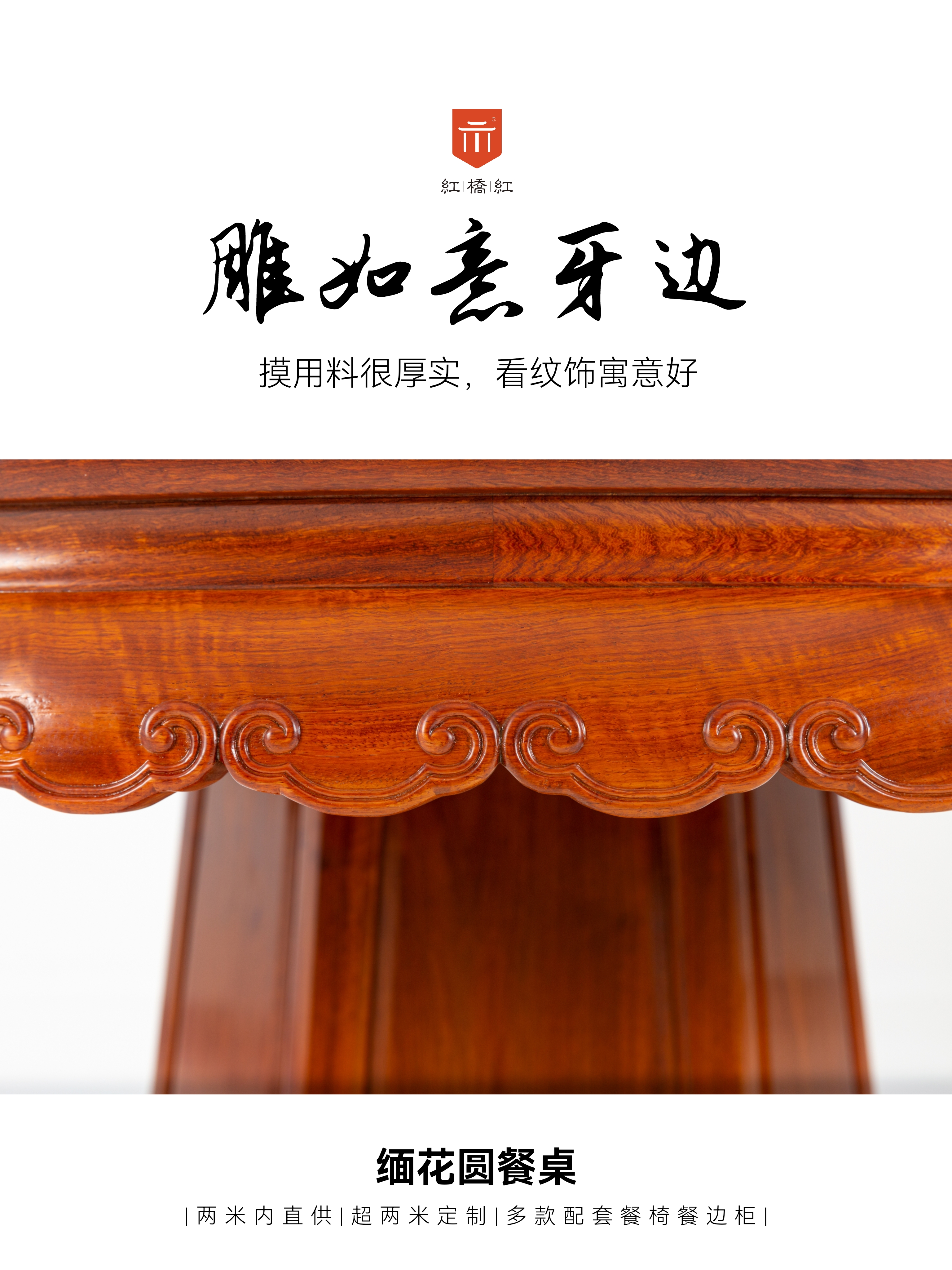 人间烟火,莫过圆满。这款如意圆餐桌,牙板加厚,束腰下通圈浮刻如意纹,象征家庭幸福吉祥;束腰面板下挂牙结构是非常受力的,整器同层餐台同料所开,寓和谐同心;大小规格围坐适合不同人数,家人围坐,团结情感,共享美味佳肴,其乐融融;底座采用传统步步高升的做法,十分稳固。搭配灯挂椅,适宜大部分城市生活空间。