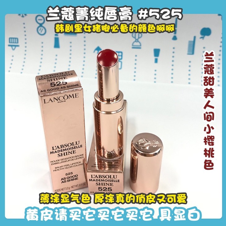 兰蔻菁纯唇膏 #525👍如果要选一支春夏显白口红💄,请一定要考虑这支兰蔻甜美人间小樱桃色🍒!感觉就是韩剧里女猪脚必备的颜色啊啊啊啊💕,香味是水蜜桃味🍑,甜进你的心~完全就是一支很活泼鲜嫩的樱桃红👅,颜色特别的正。薄涂显气色,厚涂真的俏皮又可爱👯~关键整个嘴水嫩嫩的,还会呈现水水的反光,清透又水灵✨。黄皮请买它买它买它❗❗