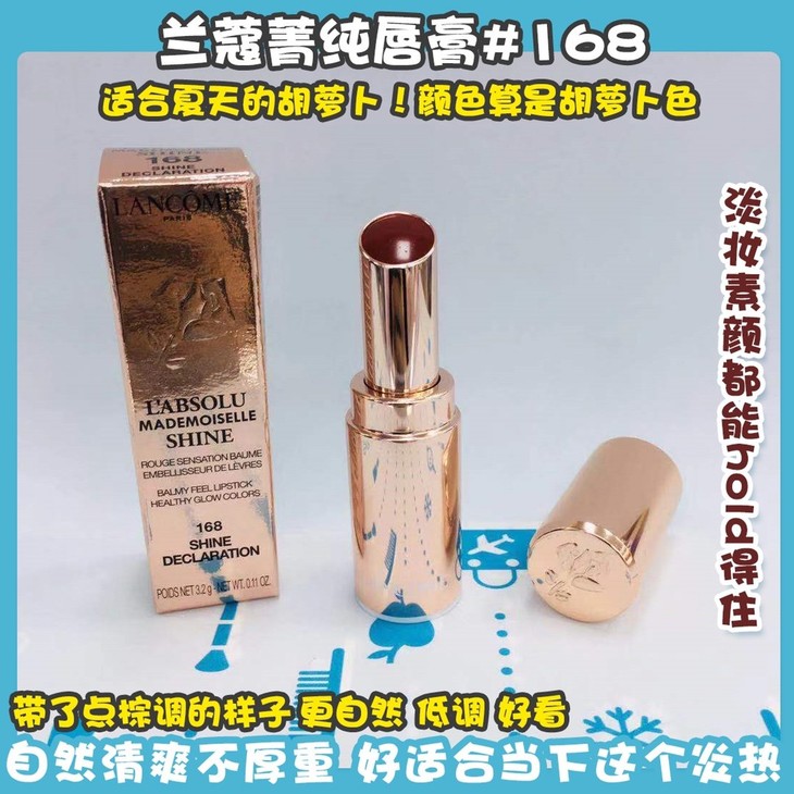 兰蔻菁纯唇膏#168👍适合夏天的胡萝卜🥕!颜色算是胡萝卜色😊,带了点棕调的样子👅,更自然、低调、好看💕!薄涂一点就很显色啦🤗,淡妆素颜都能hold得住👯。厚涂更漂亮哦🌟,好像是一根带着水滴的胡萝卜💦。多次叠涂毫无压力,上嘴很元气😇,自然清爽不厚重🍃,好适合当下这个炎热☀的季节呀~