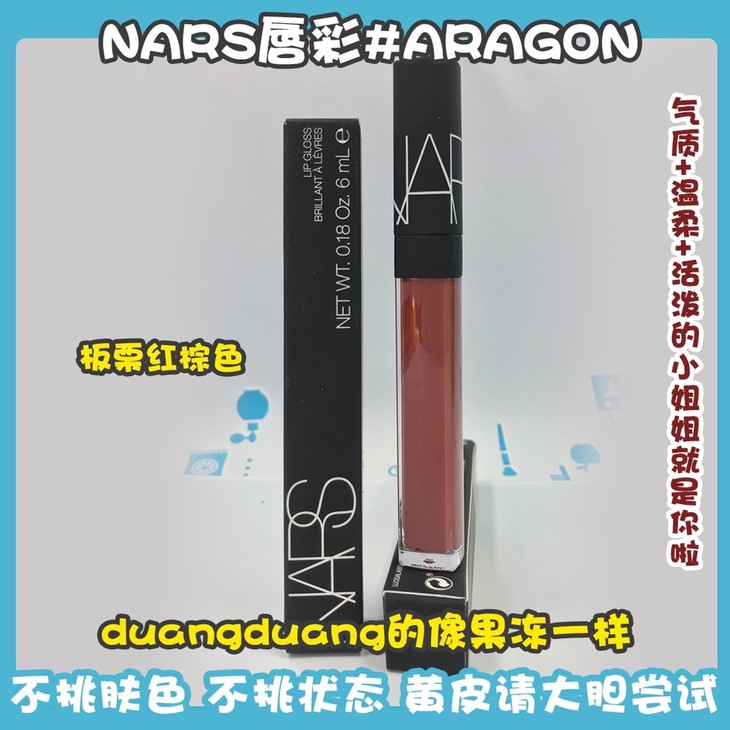 NARS唇彩#ARAGON👍秋冬必备口红❣依旧是貌美能打的板栗红棕色😇,打造红棕奶茶玻璃唇👄!气质+温柔+活泼的小姐姐就是你啦。🙅不挑肤色!🙅不挑状态!💁黄皮请大胆尝试这个颜色,就是温暖的红棕☀。唇蜜质地✨,上嘴遮盖力中等,显色的同时也很清透💧,涂上显得嘴duangduang的像果冻一样~