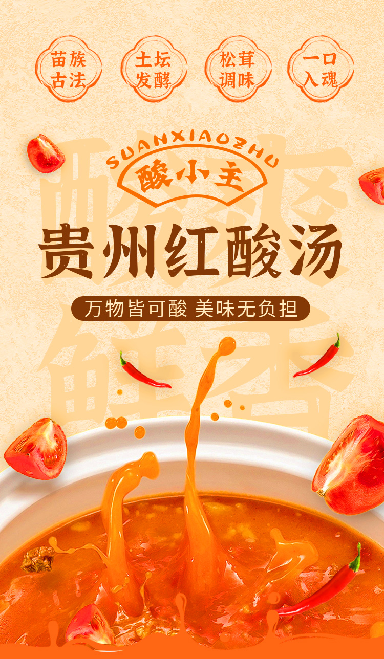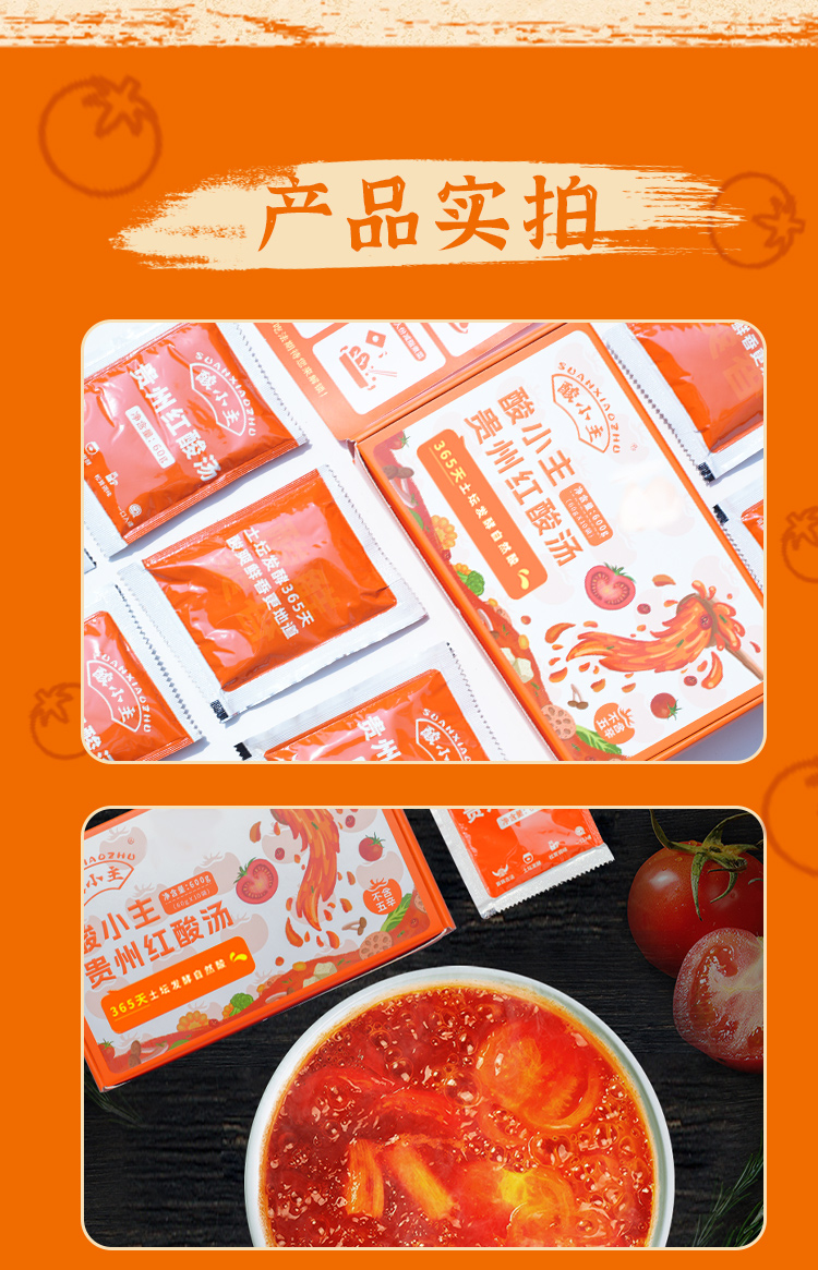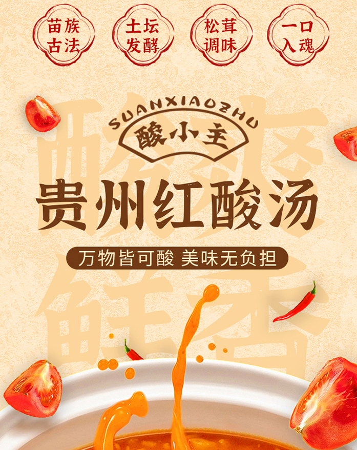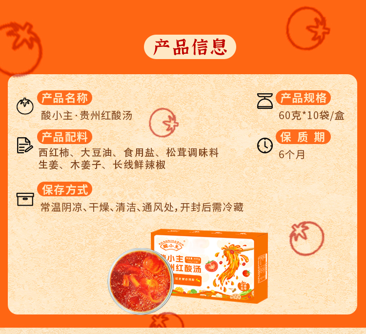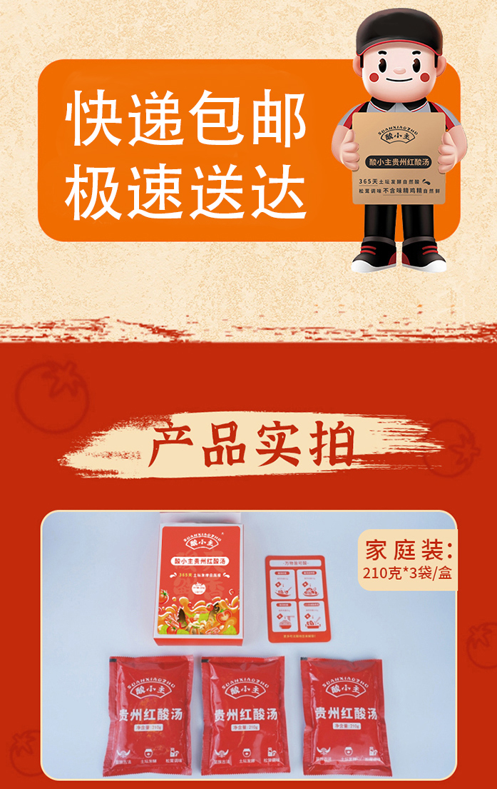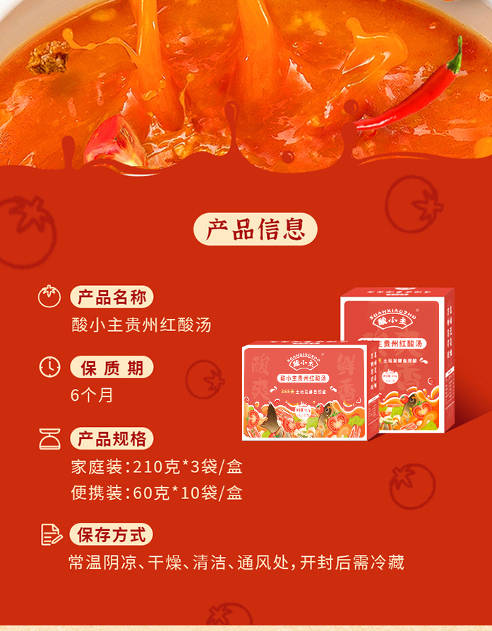 品名:酸小主红酸汤 发货地/产地:贵州/贵州保质期:6个月,建议收到后尽快食用。包装方式:袋装物流信息:顺丰、四通一达或其它普通快递随机,不接受指定快递。不发货区域:西藏、港澳台及疫情管控区。 |