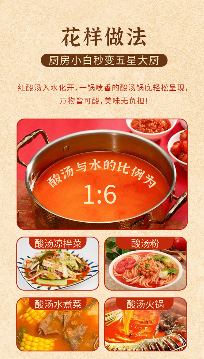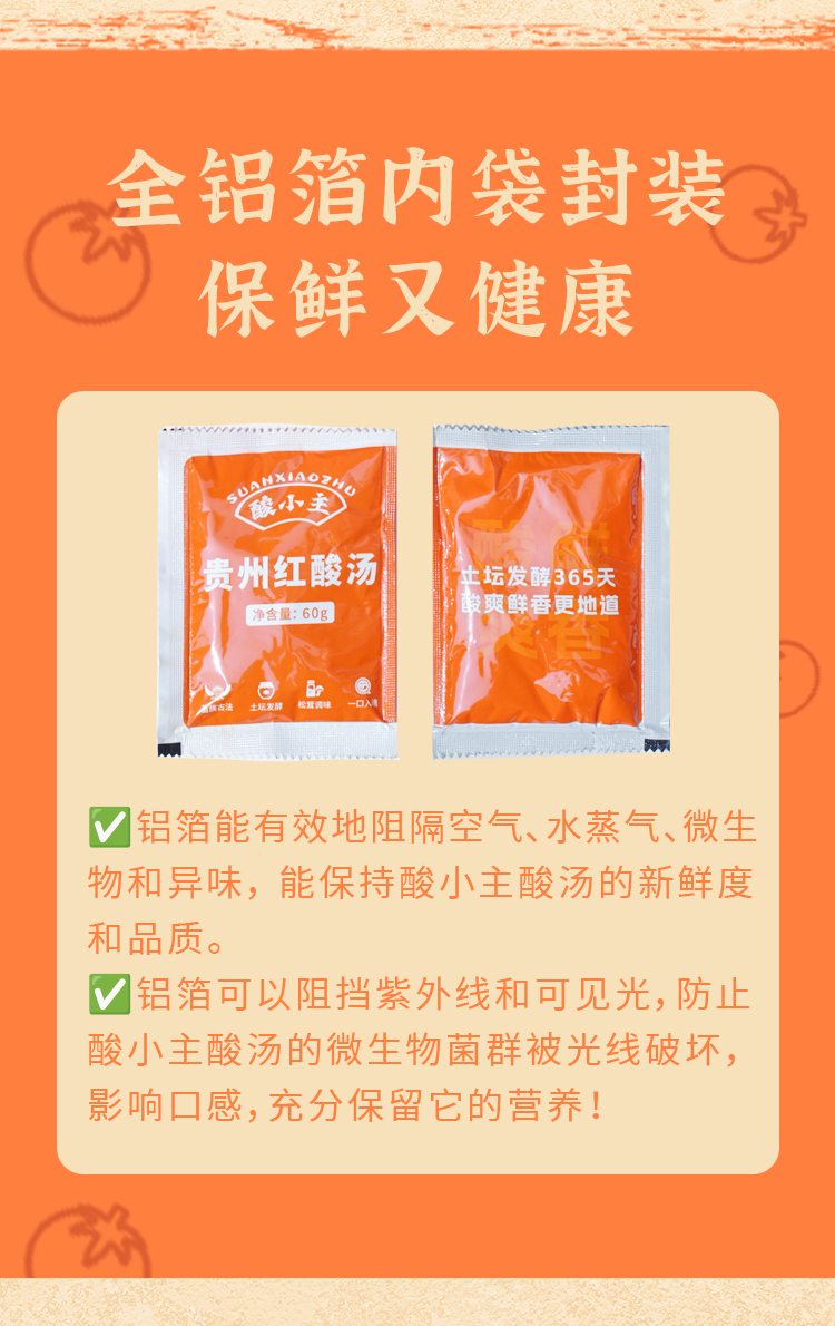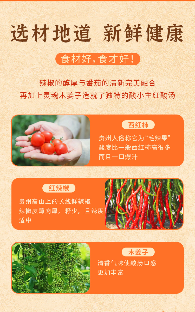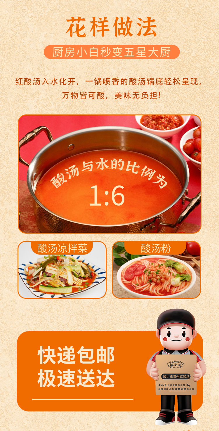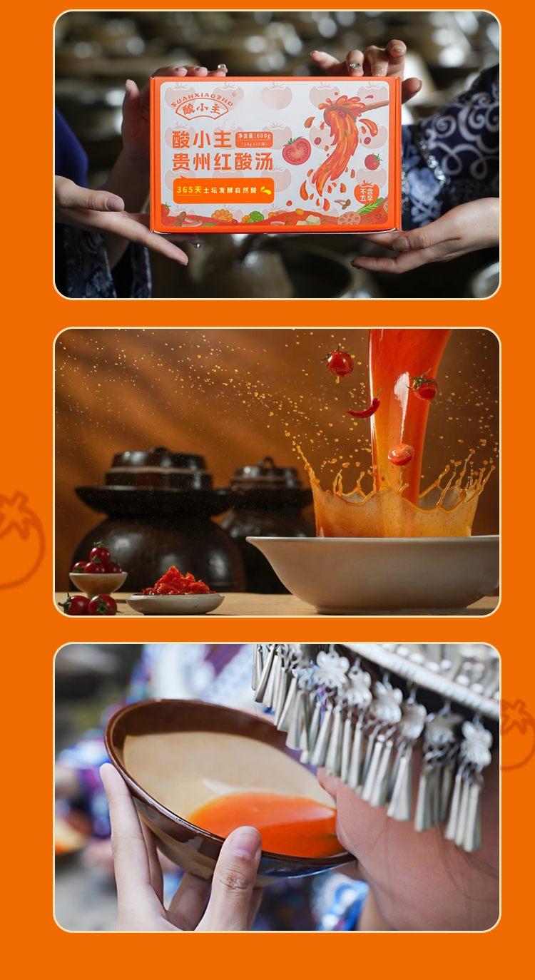 品名:酸小主红酸汤 发货地/产地:贵州/贵州保质期:6个月,建议收到后尽快食用。包装方式:袋装物流信息:顺丰、四通一达或其它普通快递随机,不接受指定快递。不发货区域:西藏、港澳台及疫情管控区。 |