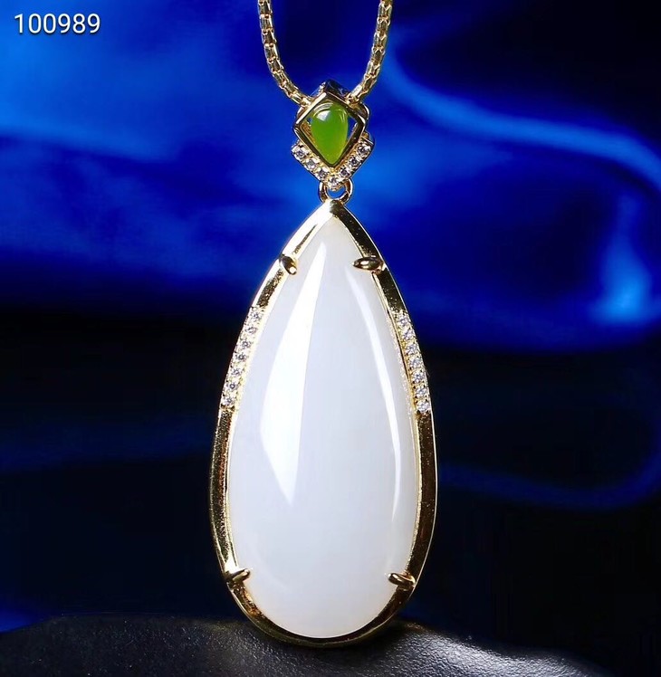 s925银镶和田玉羊脂玉水滴吊坠,料子干净细腻,白度一级,配镶碧玉一枚点缀,电镀三层24k黄金色,带银链子。
