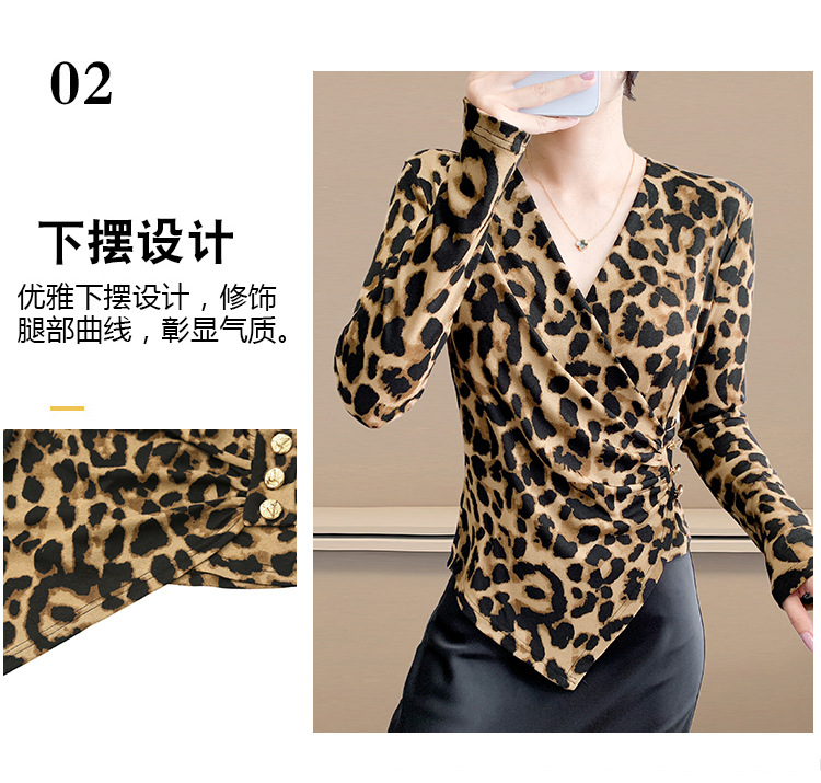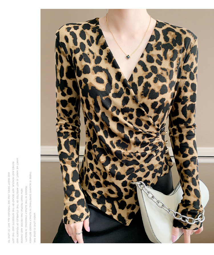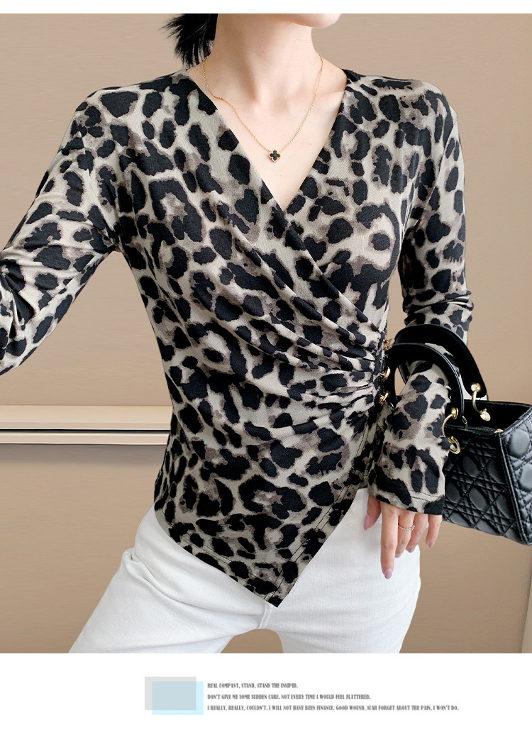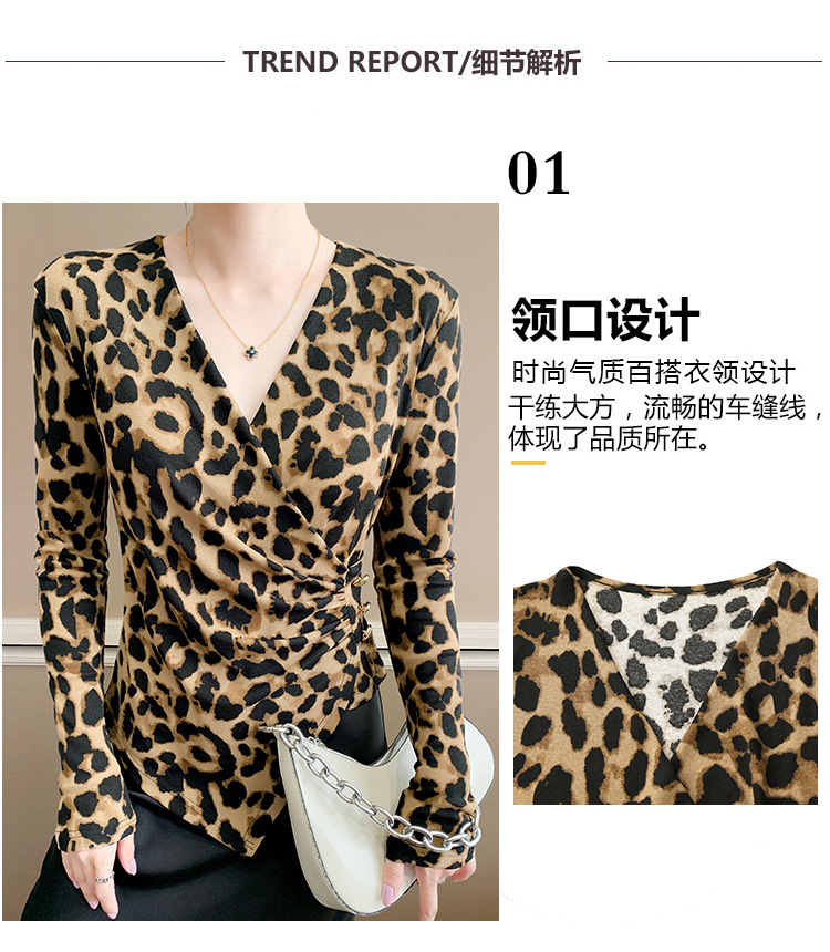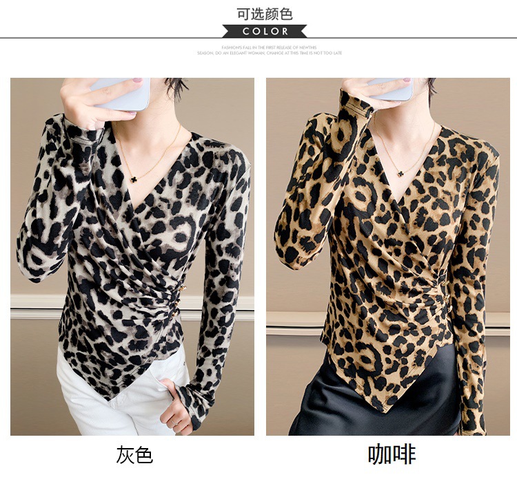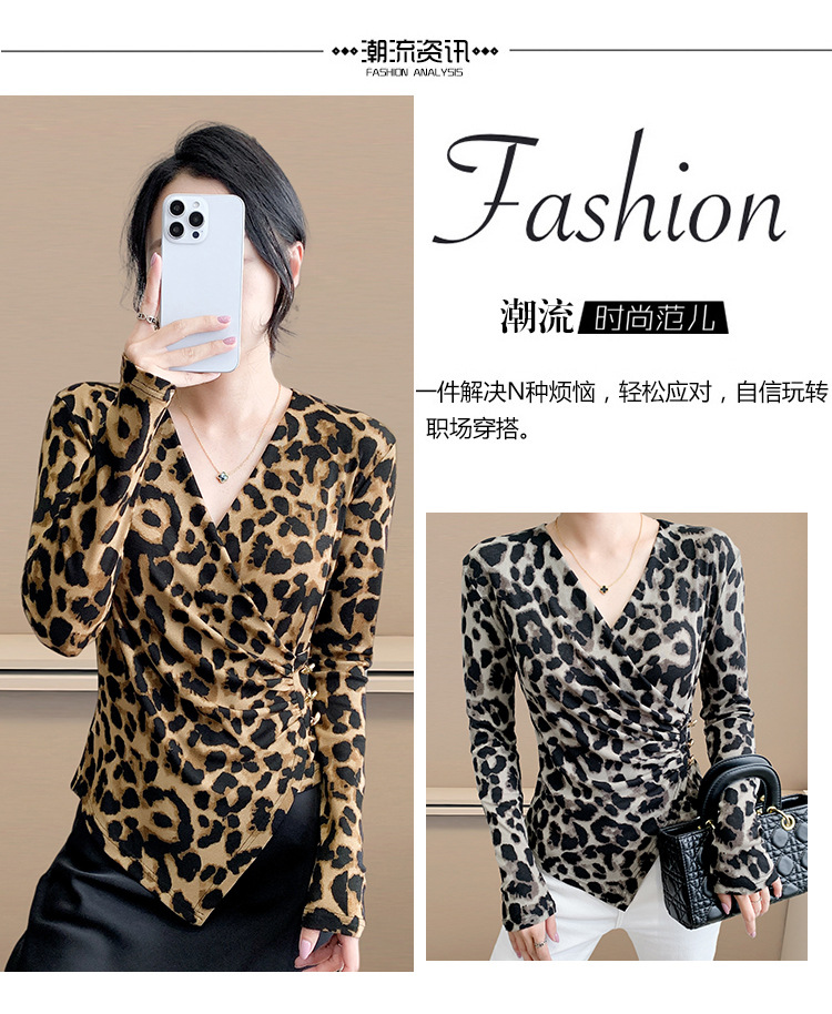 KQL 359H8322新款V领长袖收腰性感豹纹洋气修身显瘦不规则上衣