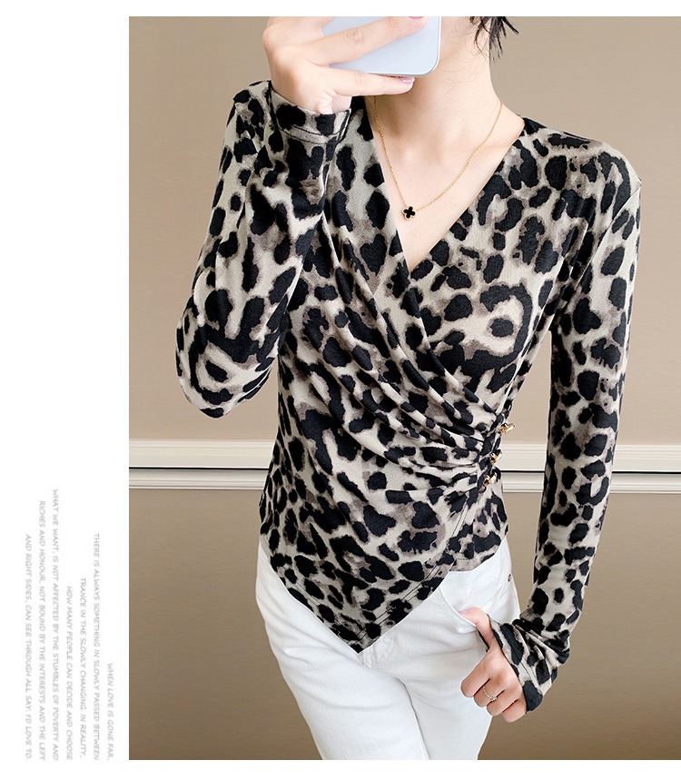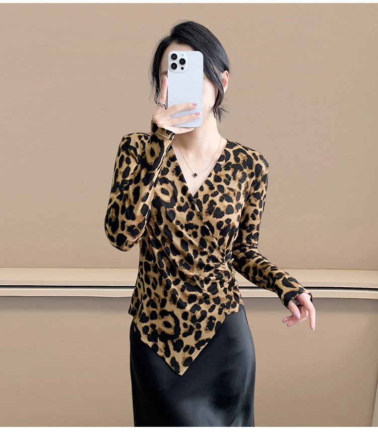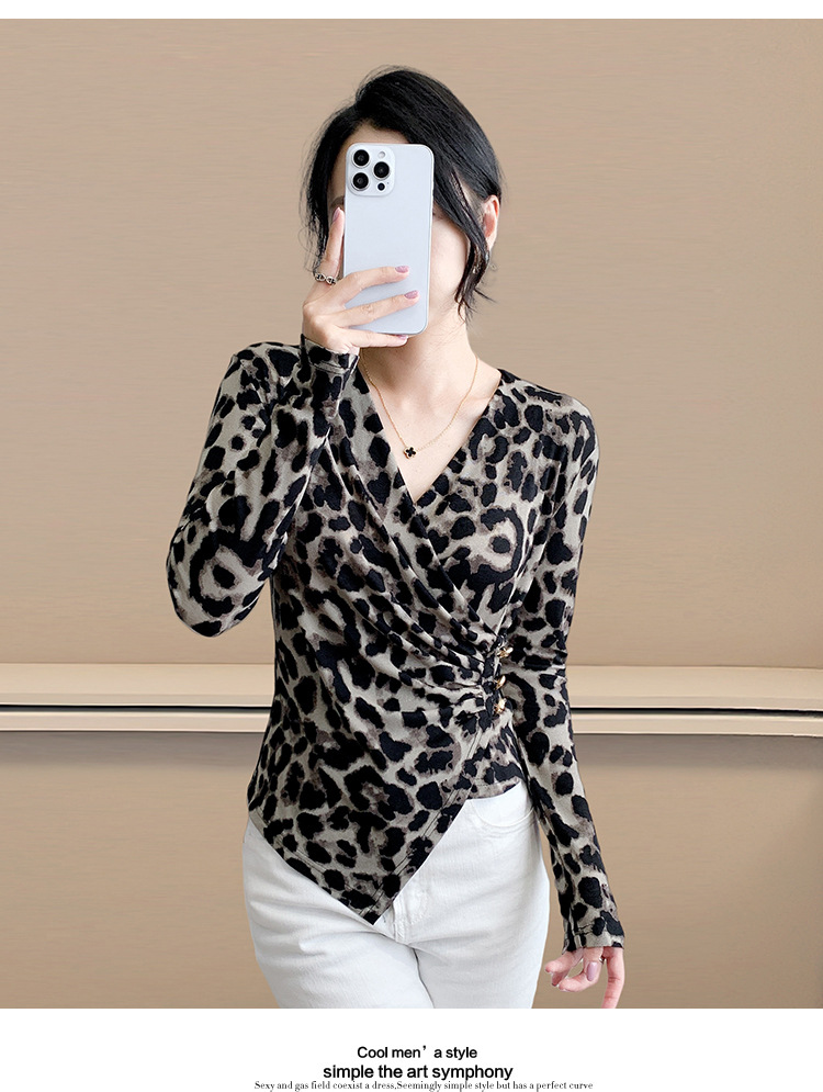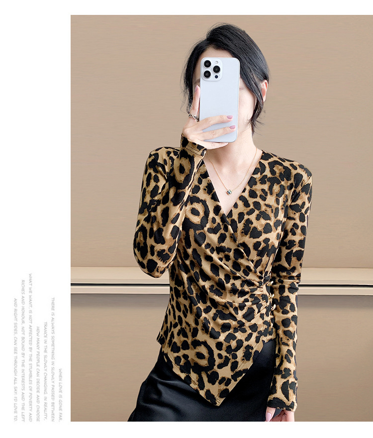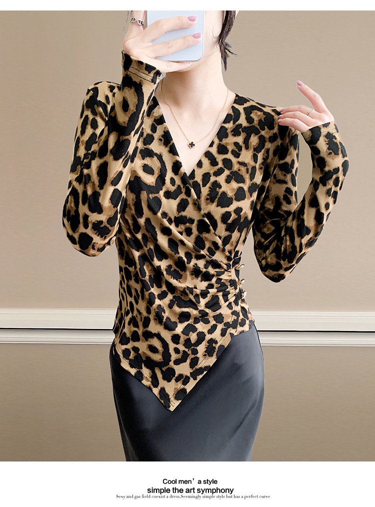 KQL 359H8322新款V领长袖收腰性感豹纹洋气修身显瘦不规则上衣