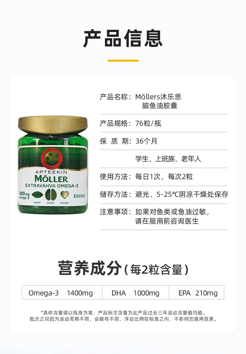 【跨境】挪威Mollers 沐乐思深海鱼油DHA 76粒/瓶 omega3