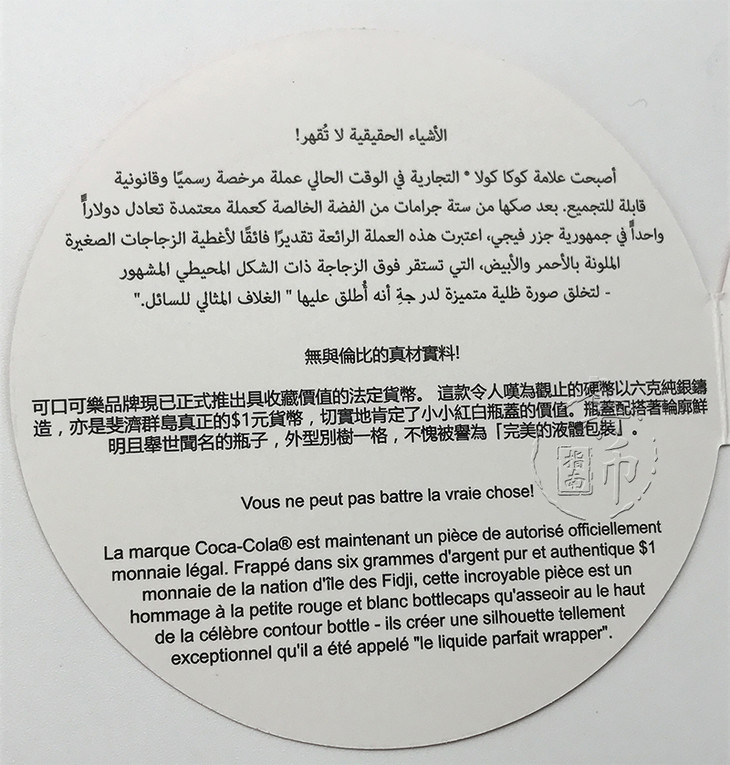 2018斐济可口可乐瓶盖形彩色银币