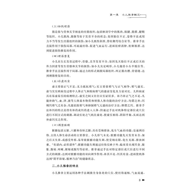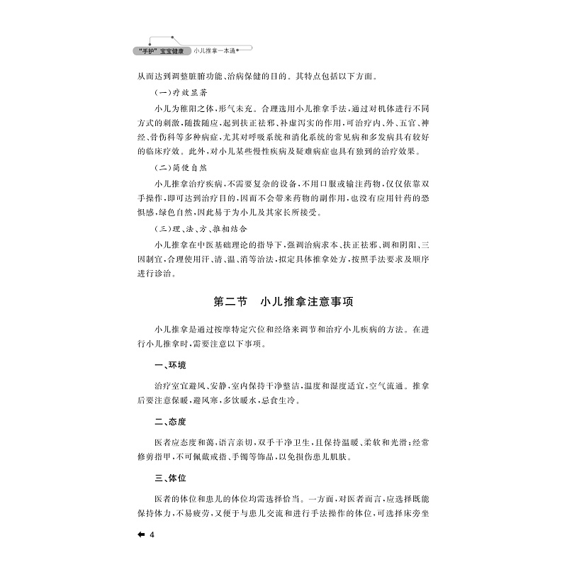 本书共六章,基础部分介绍儿童生理病理及体质喂养、小儿病因病机及辨治、小儿推拿基本知识、小儿推拿穴位及手法;临床部分,重点介绍儿童常见疾病,如小儿感冒、发热、咳嗽、泄泻、呕吐、厌食、惊风、遗尿等的推拿治疗及调护等;保健篇,分别针对儿童体质特点、四季特点及各年龄段特点,给出了相应的保健方案。①图文并茂,采用真人实体摄影照片,加以标定穴位及手法,可使读者快速入门,易于掌握。②内容选取更加贴近实际,如加入居家调护、健康指导等内容突出实用性。可供从事小儿推拿临床、教学、科研工作者及在中医院校师生、基层医务人员、育婴师、保育员、患儿家长及小儿推拿的爱好者参考使用。