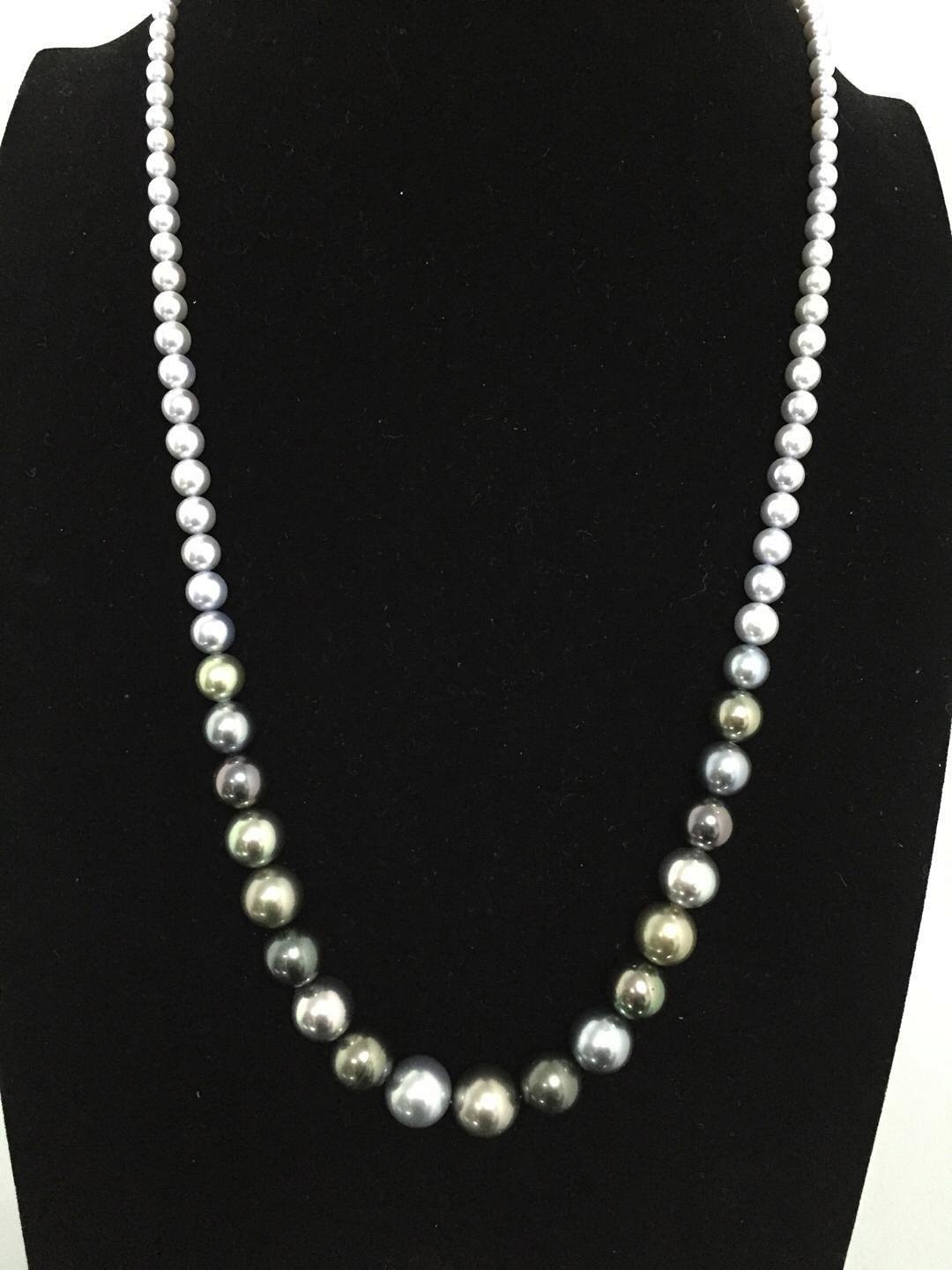 17粒天然色大溪地珍珠,发出泛蓝,泛绿,泛灰,泛红的美丽晕彩,辅以大小渐变的日本Akoya珍珠,有节奏,有变化,有色彩。如雨后彩虹,搭配任何衣物,顿显格调