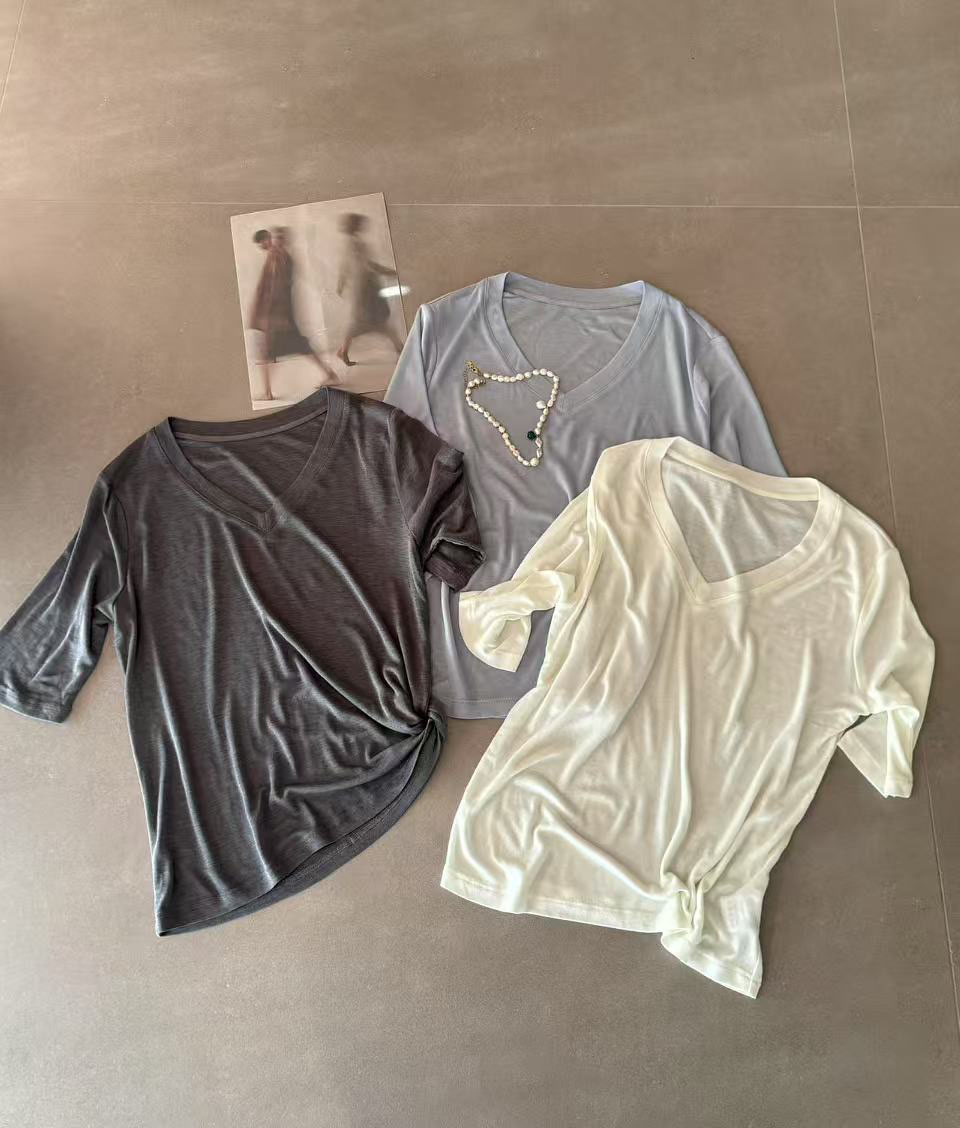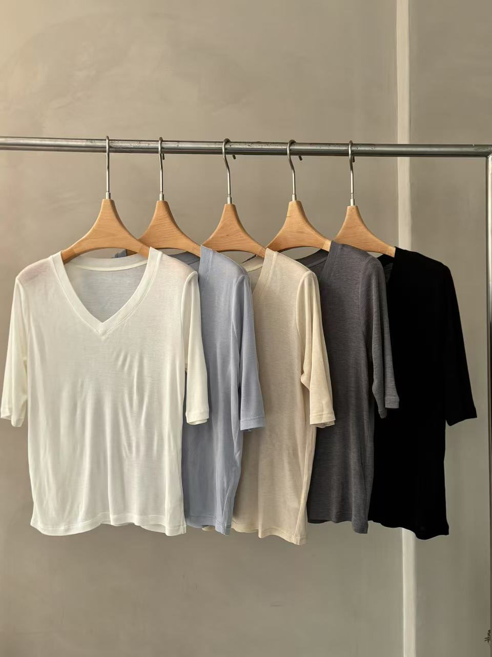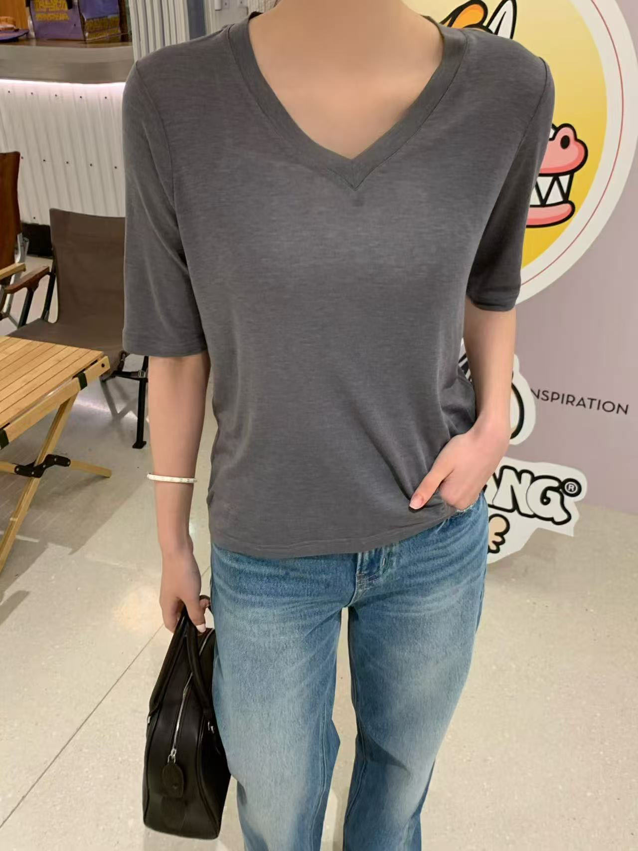 洛诗琳05739韩系慵懒随性简约纯色显瘦V领天丝羊毛T恤女62230