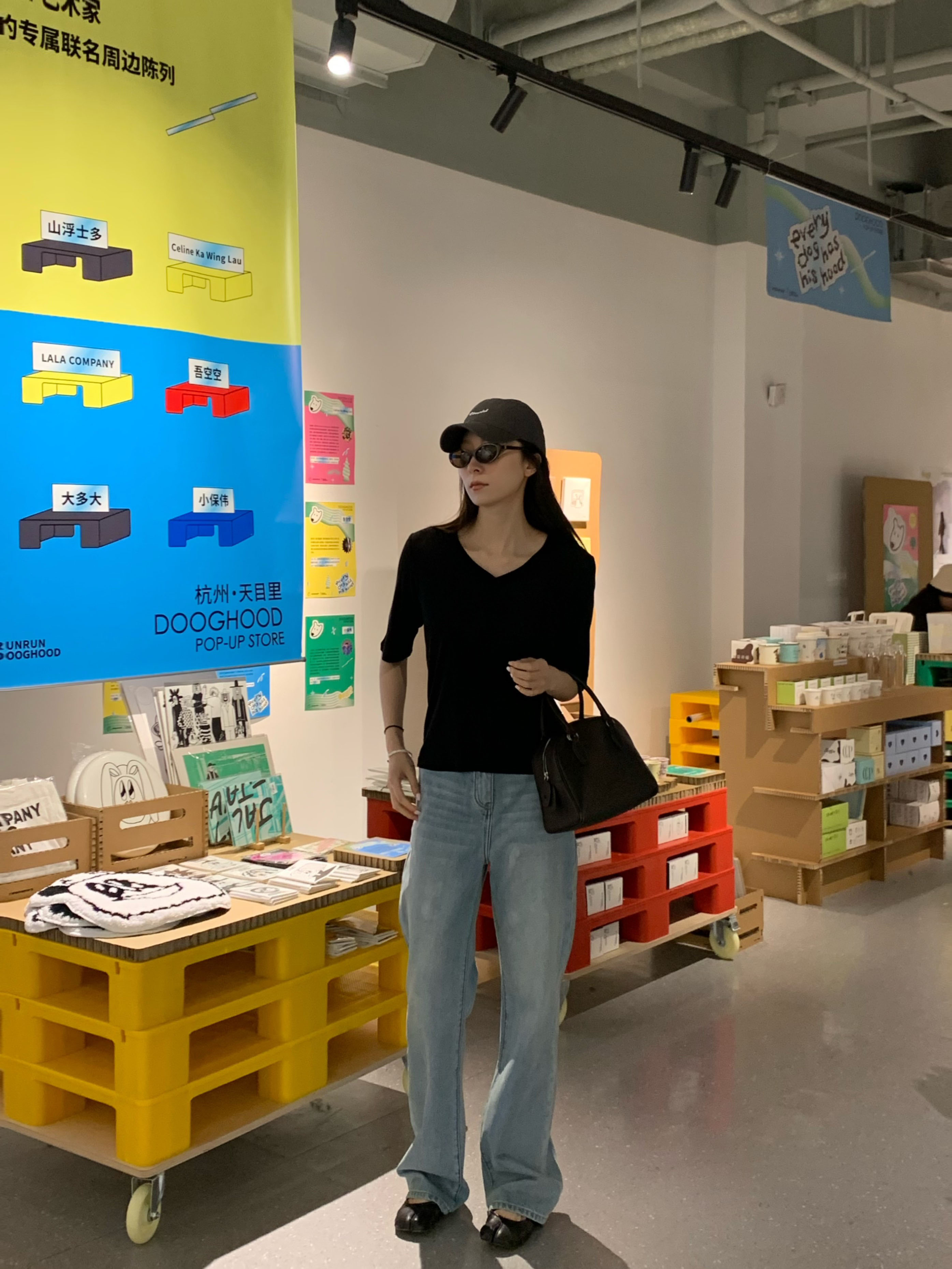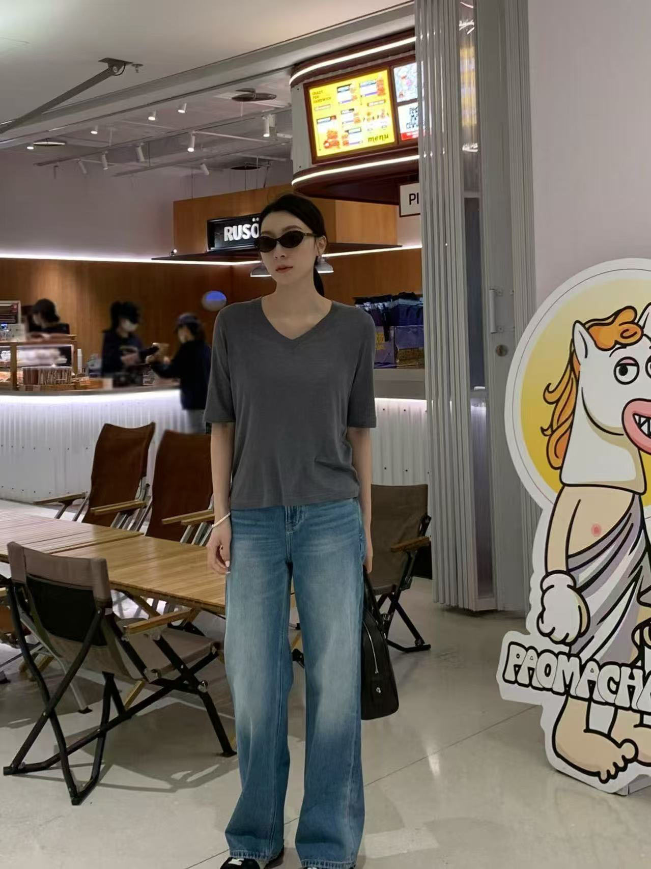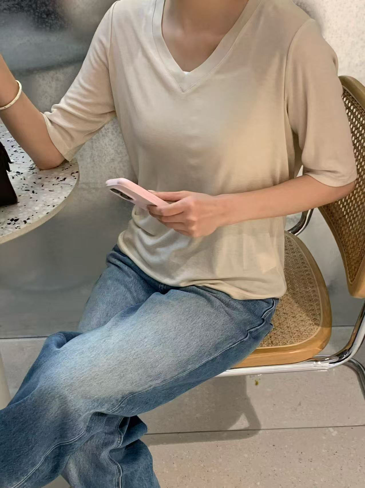 洛诗琳05739韩系慵懒随性简约纯色显瘦V领天丝羊毛T恤女62230