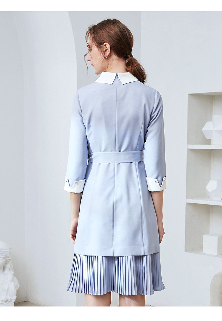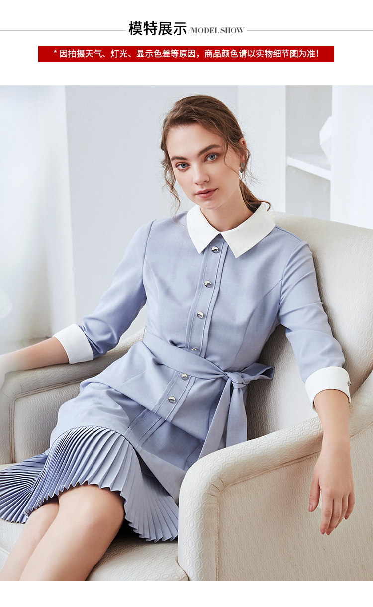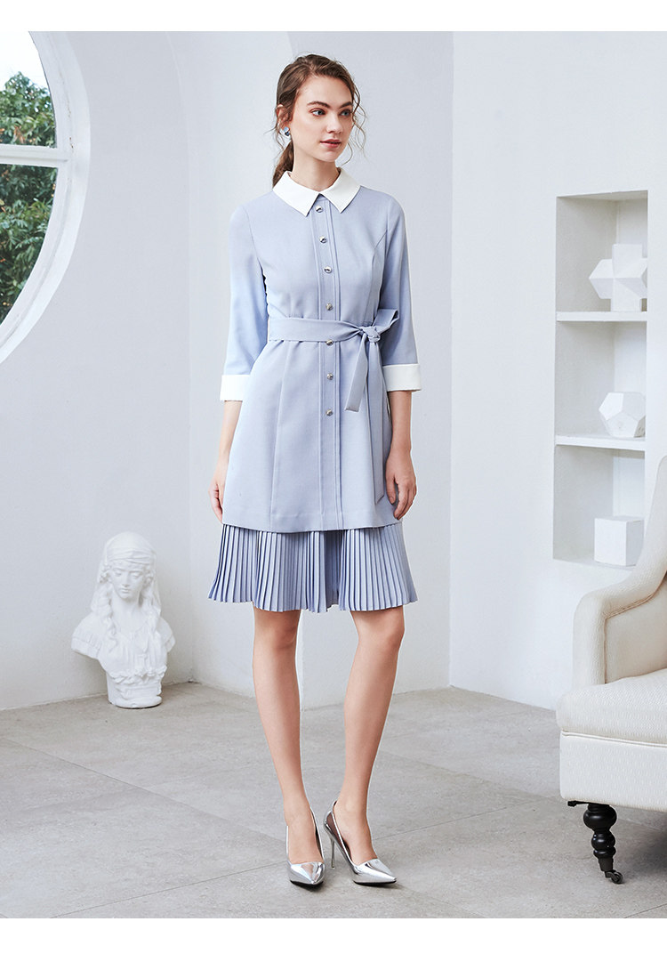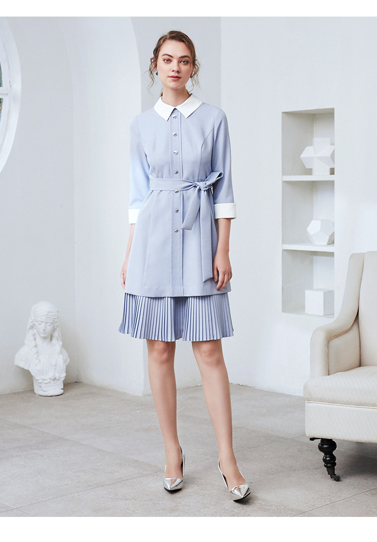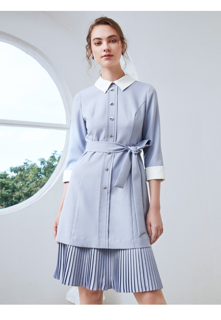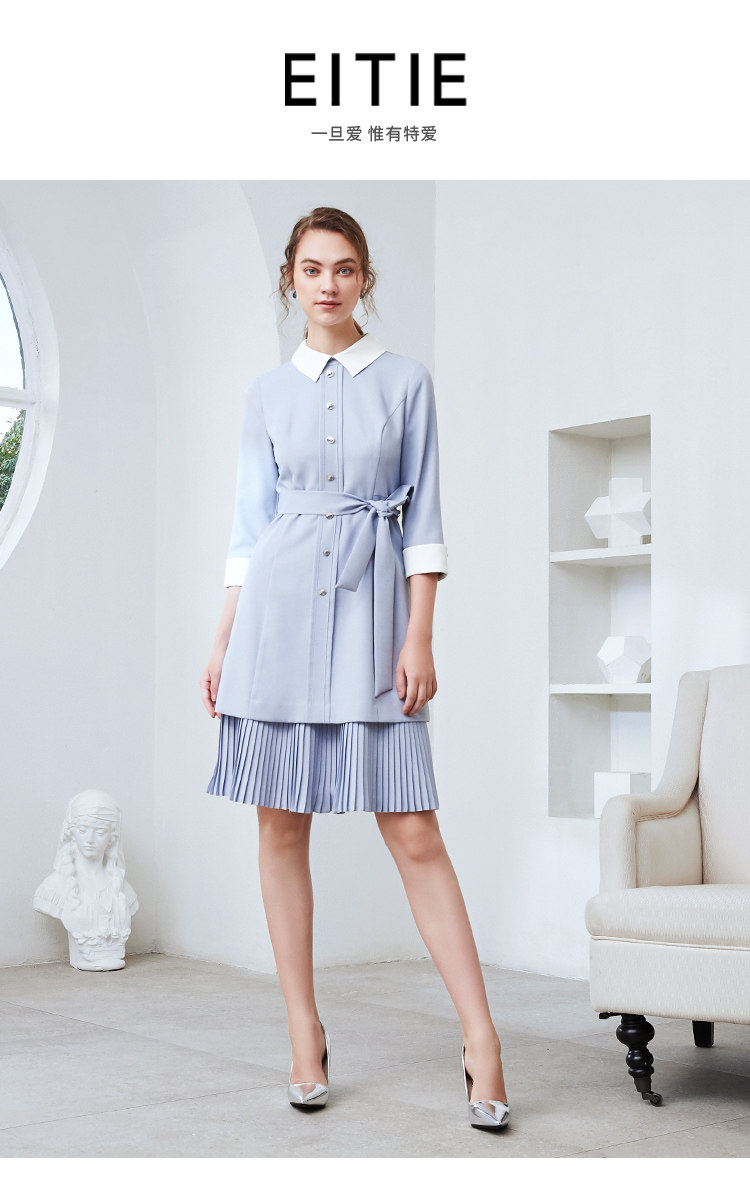 EITIE爱特爱秋季新款通勤百搭简约翻领收腰A字百褶连衣裙女裙C2007548