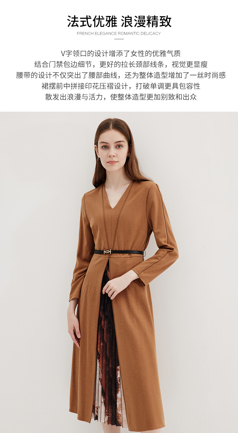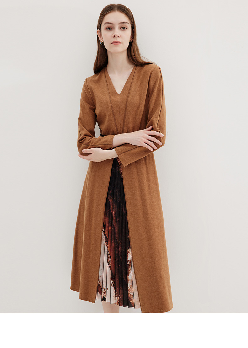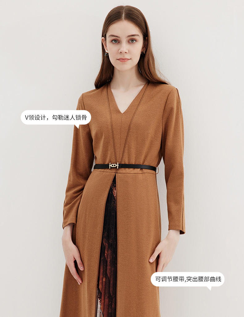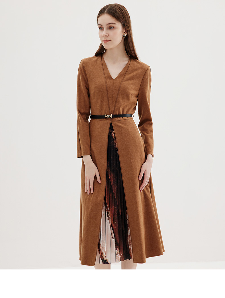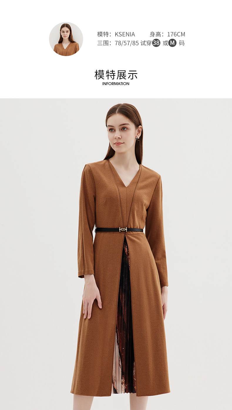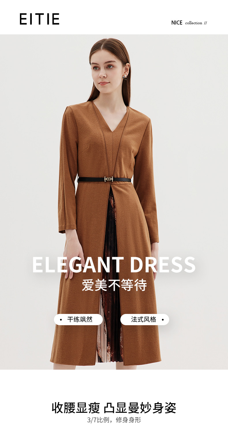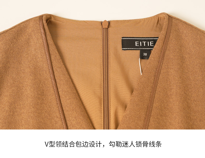 EITIE爱特爱冬季新款气质时尚V领收腰A字百褶拼接连衣裙7207904