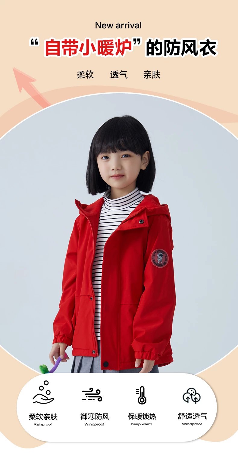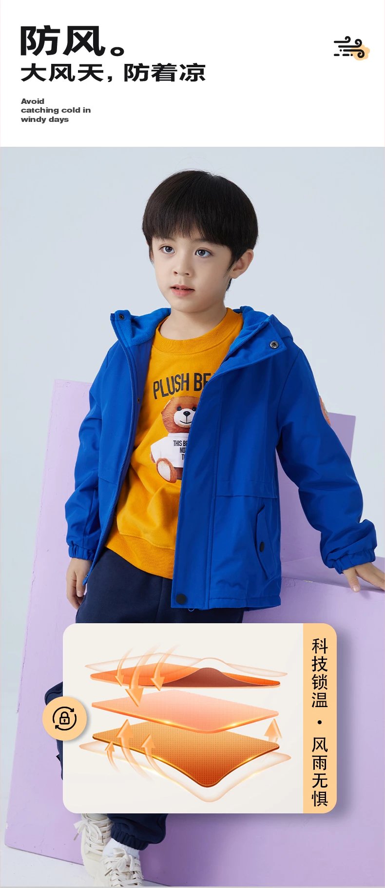 产品2 儿童单色加绒连帽防风衣 现货