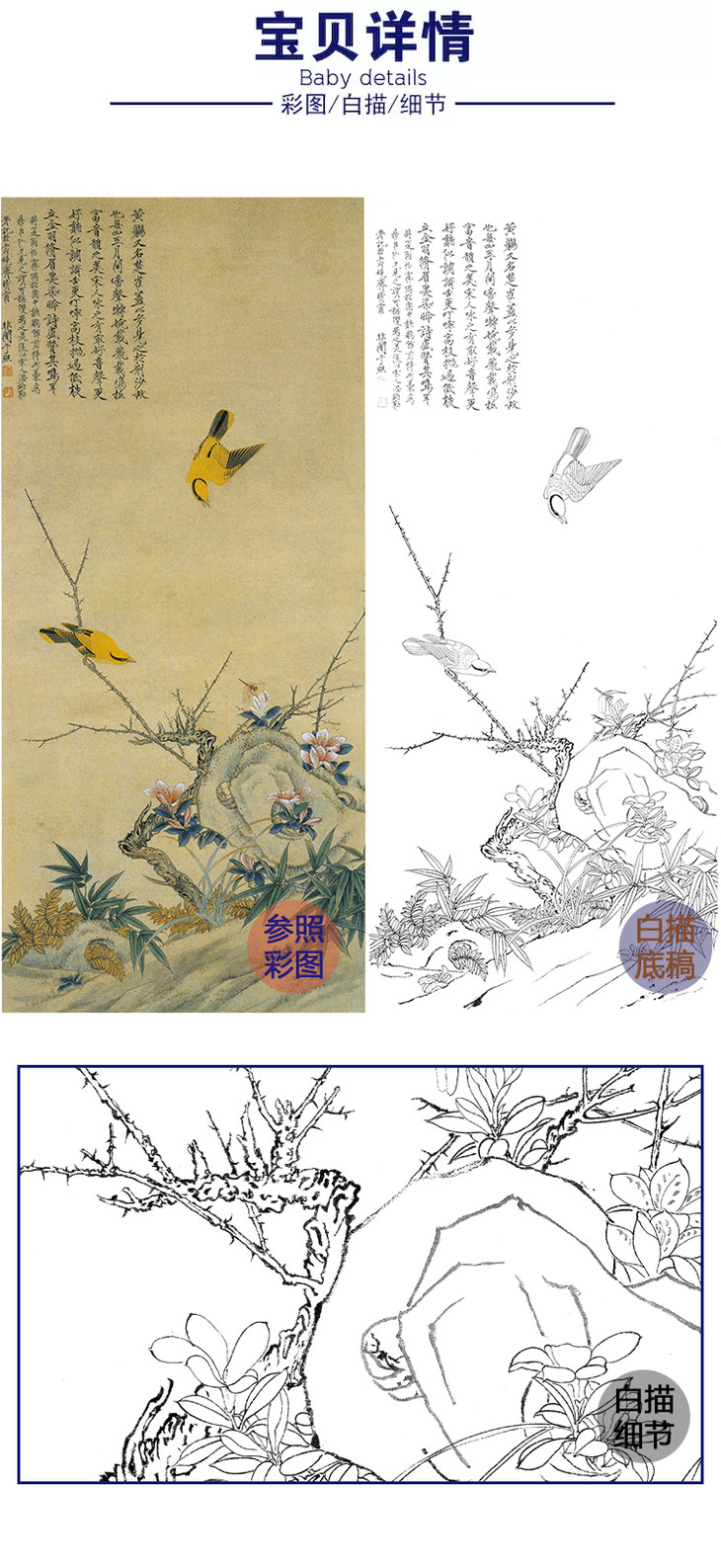 竖幅工笔花鸟白描底稿-牡丹鸽子-李晓明-A133