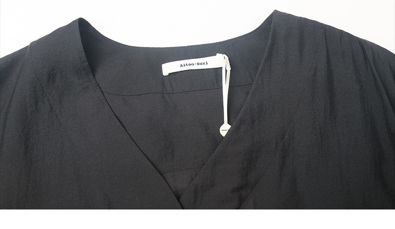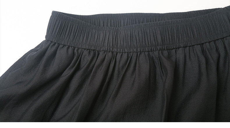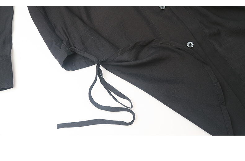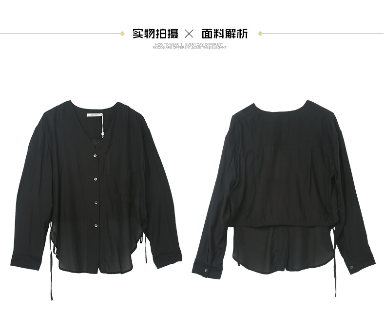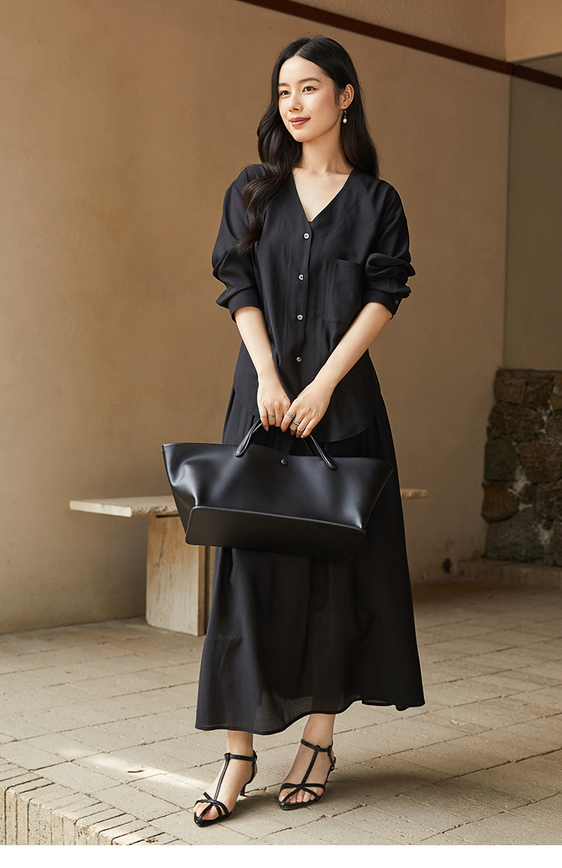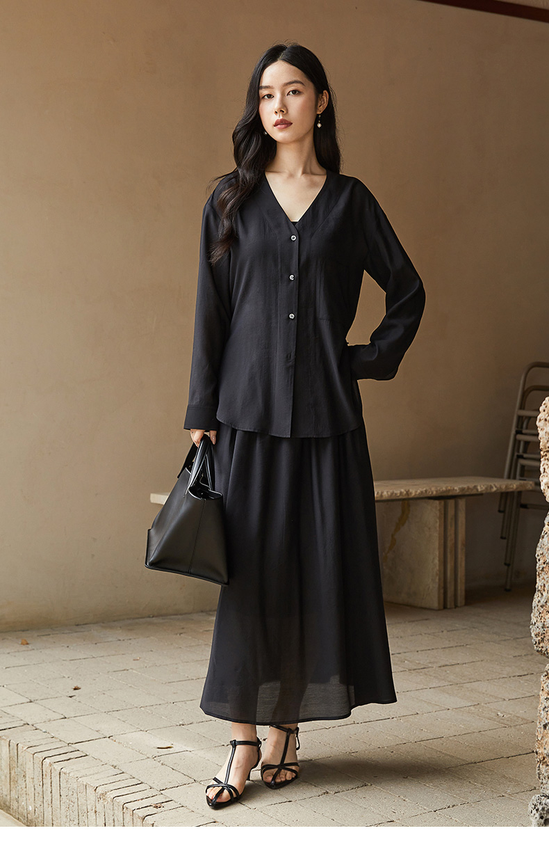 极简通勤黑色 V 领抽绳衬衫 + 高腰大摆半身裙 夏季薄款透气宽松显瘦套装