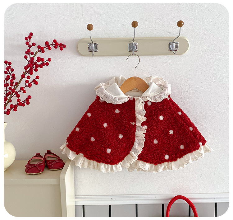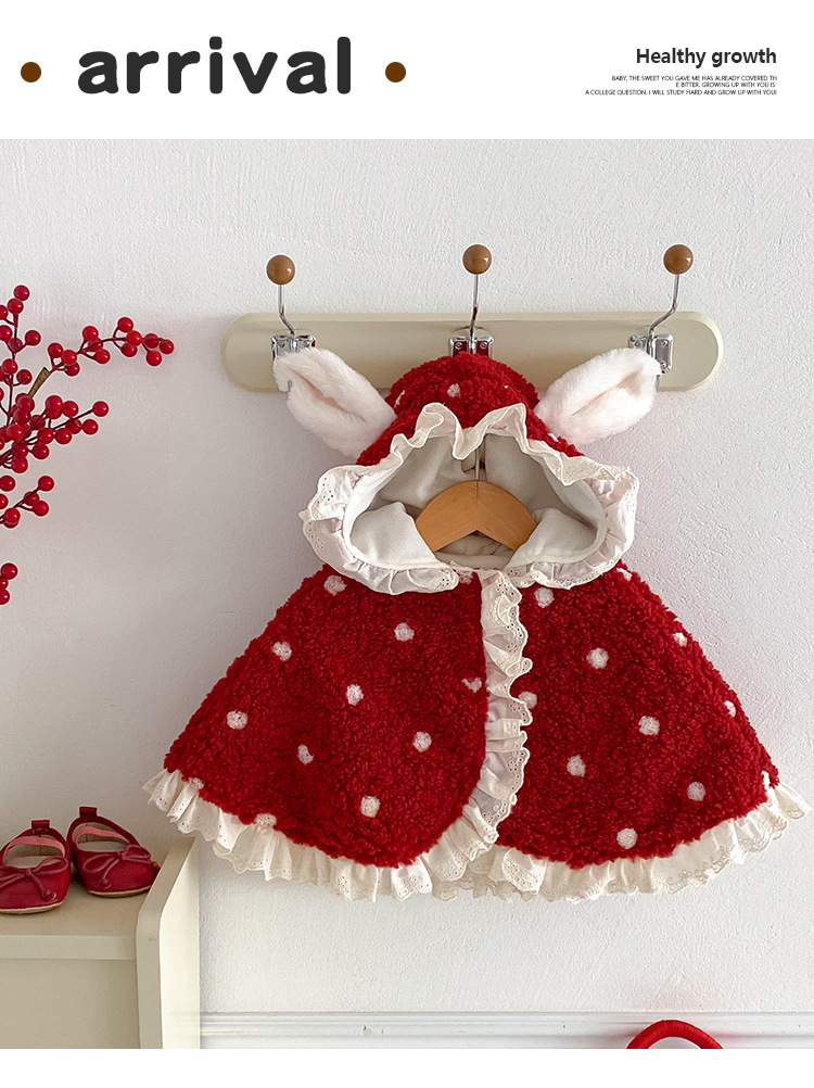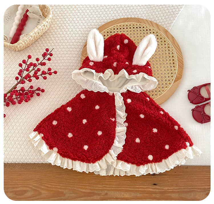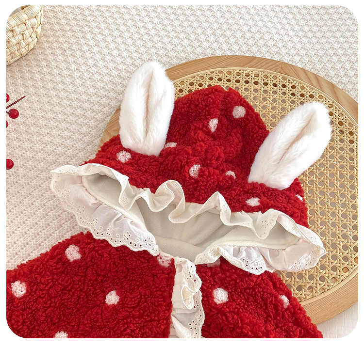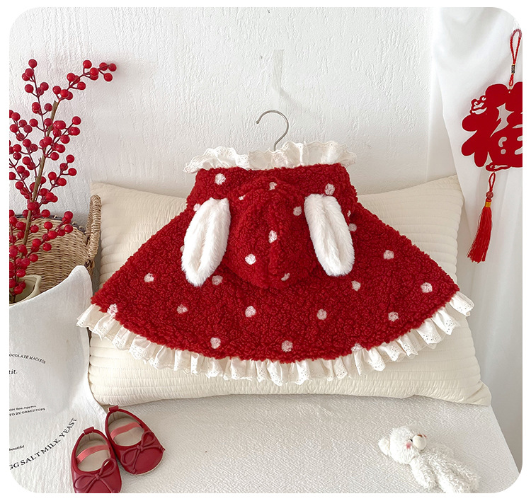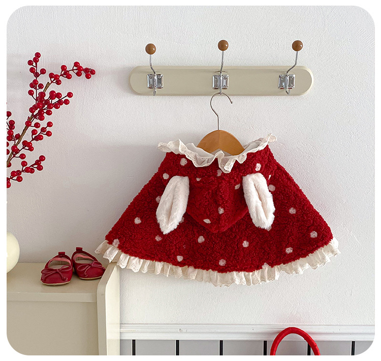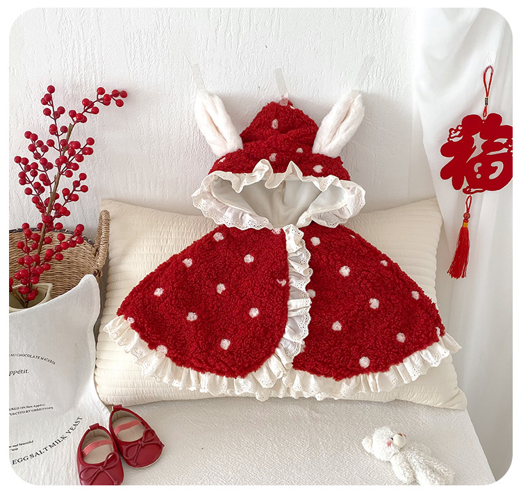 【女宝宝斗篷,花边兔耳朵设计】婴儿斗篷秋冬新款 新生女宝宝花边兔耳朵披风 外出防风公主加绒披肩-QQ