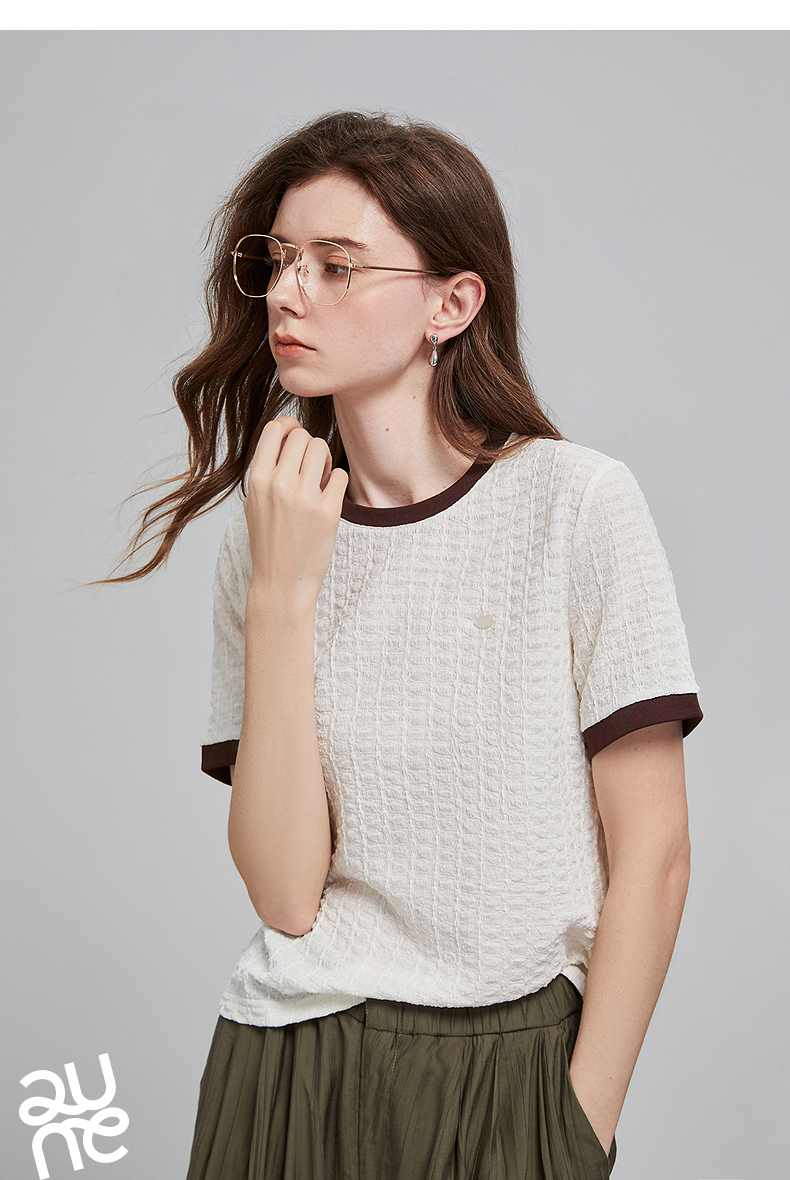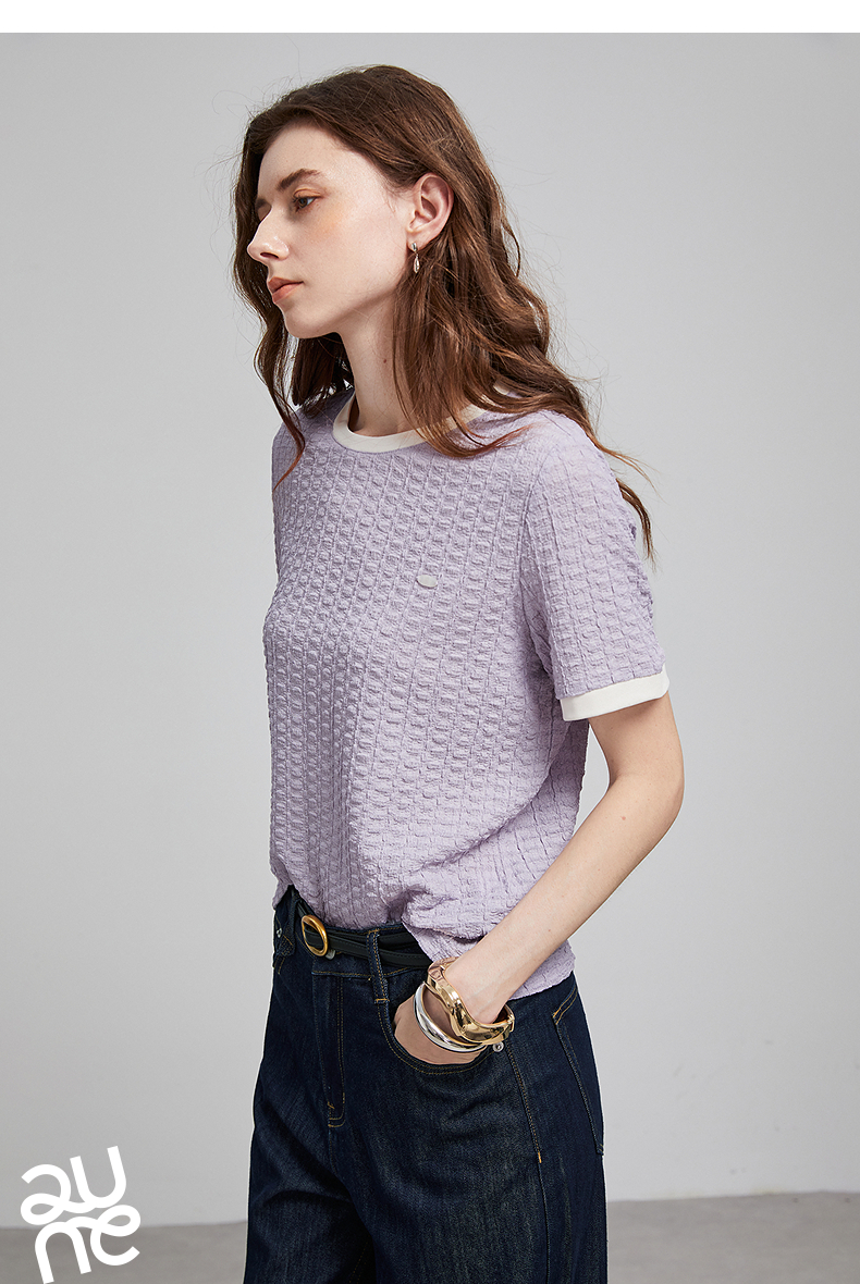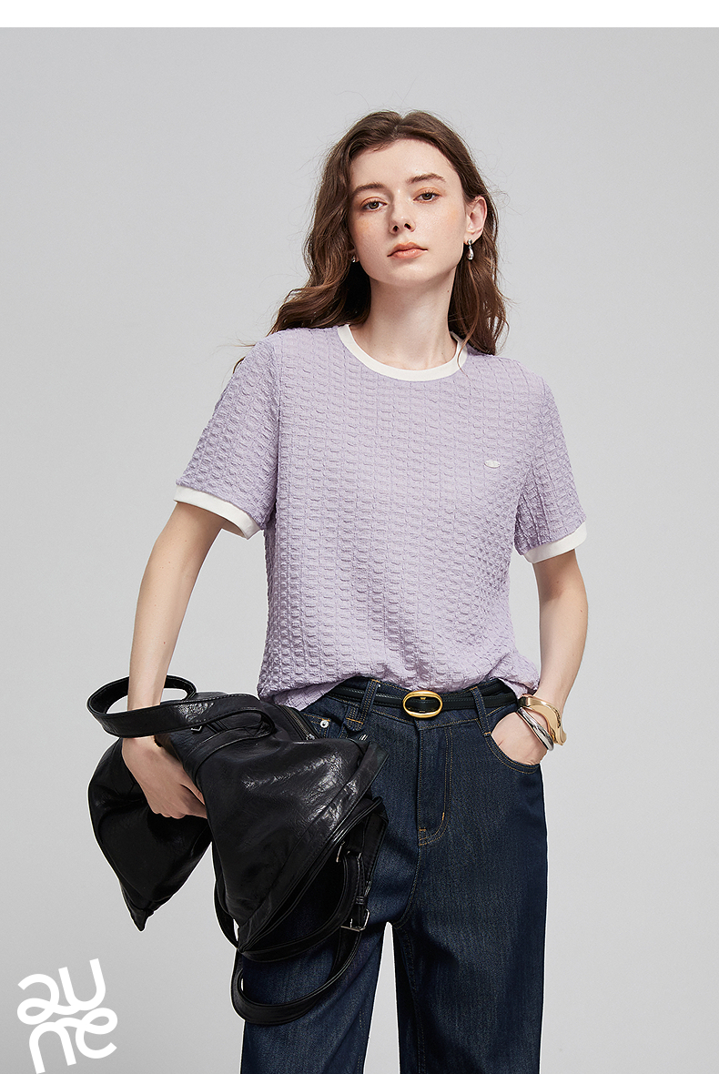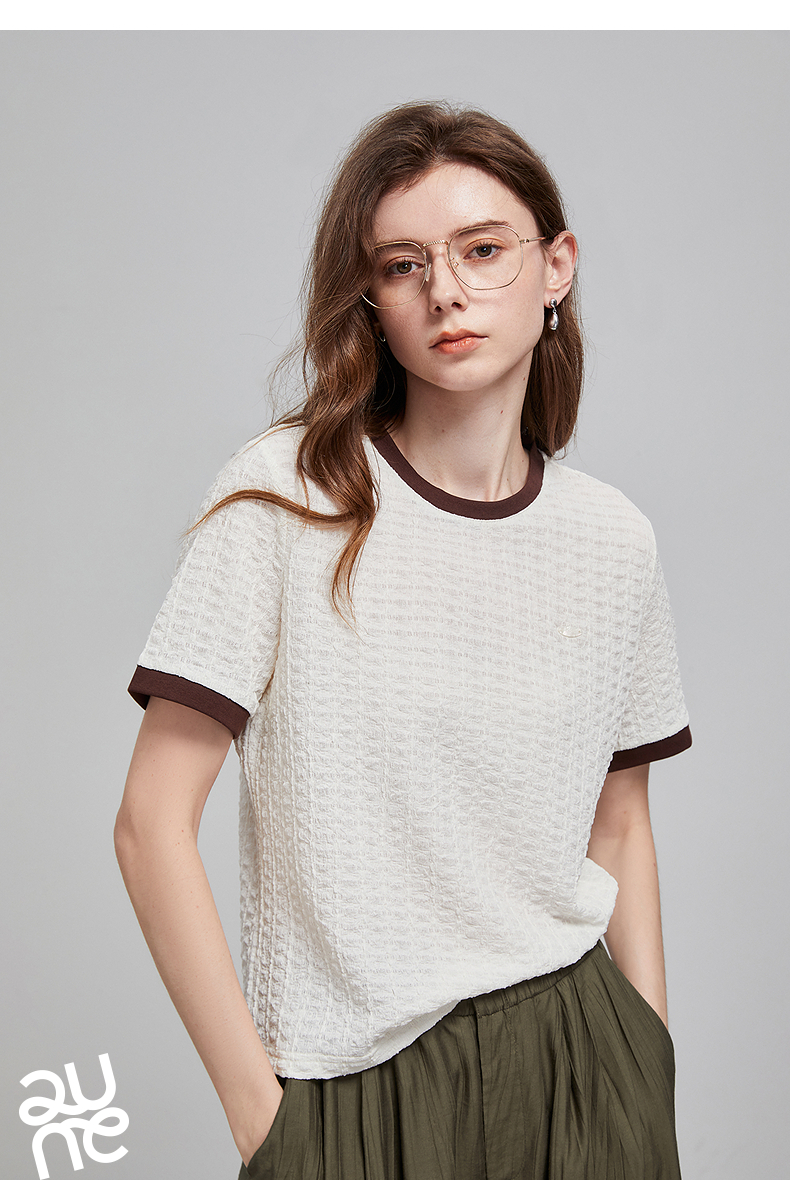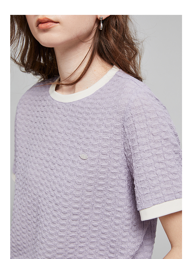 初语浮雕肌理短袖T恤女泡泡褶2025夏季新款撞色圆领别致上衣