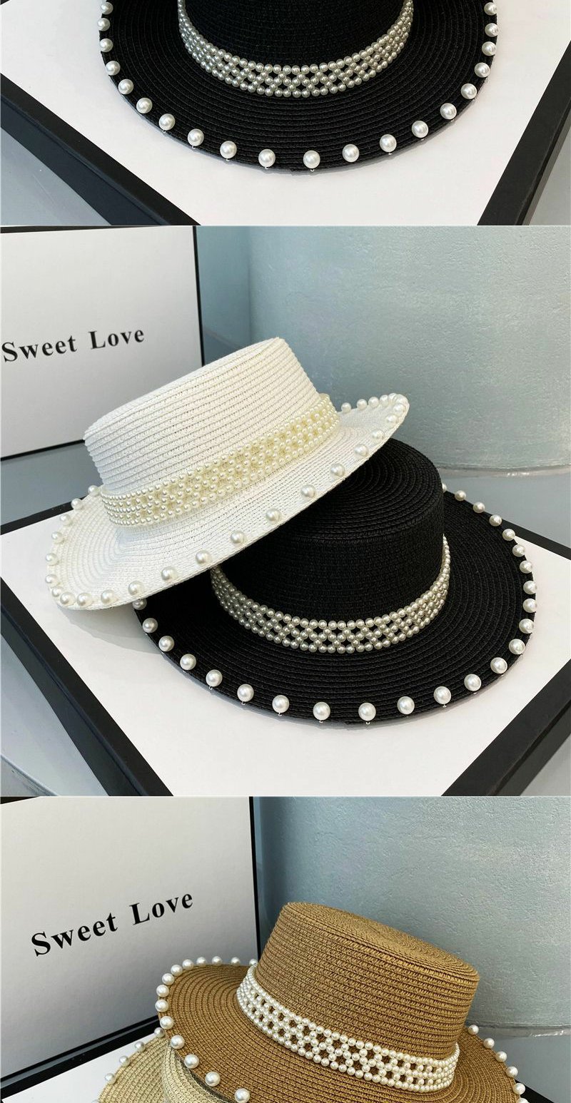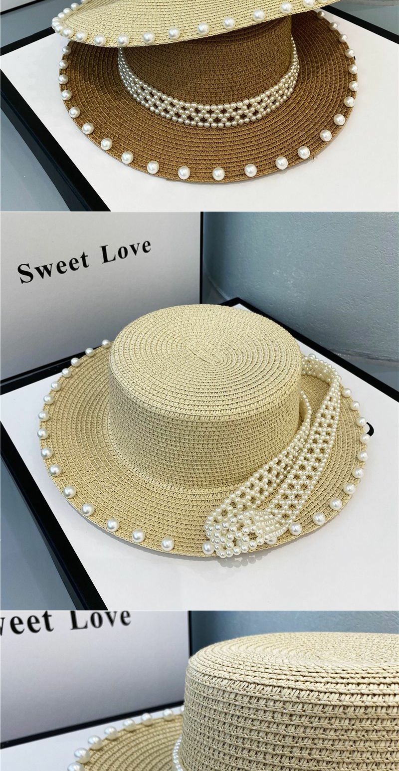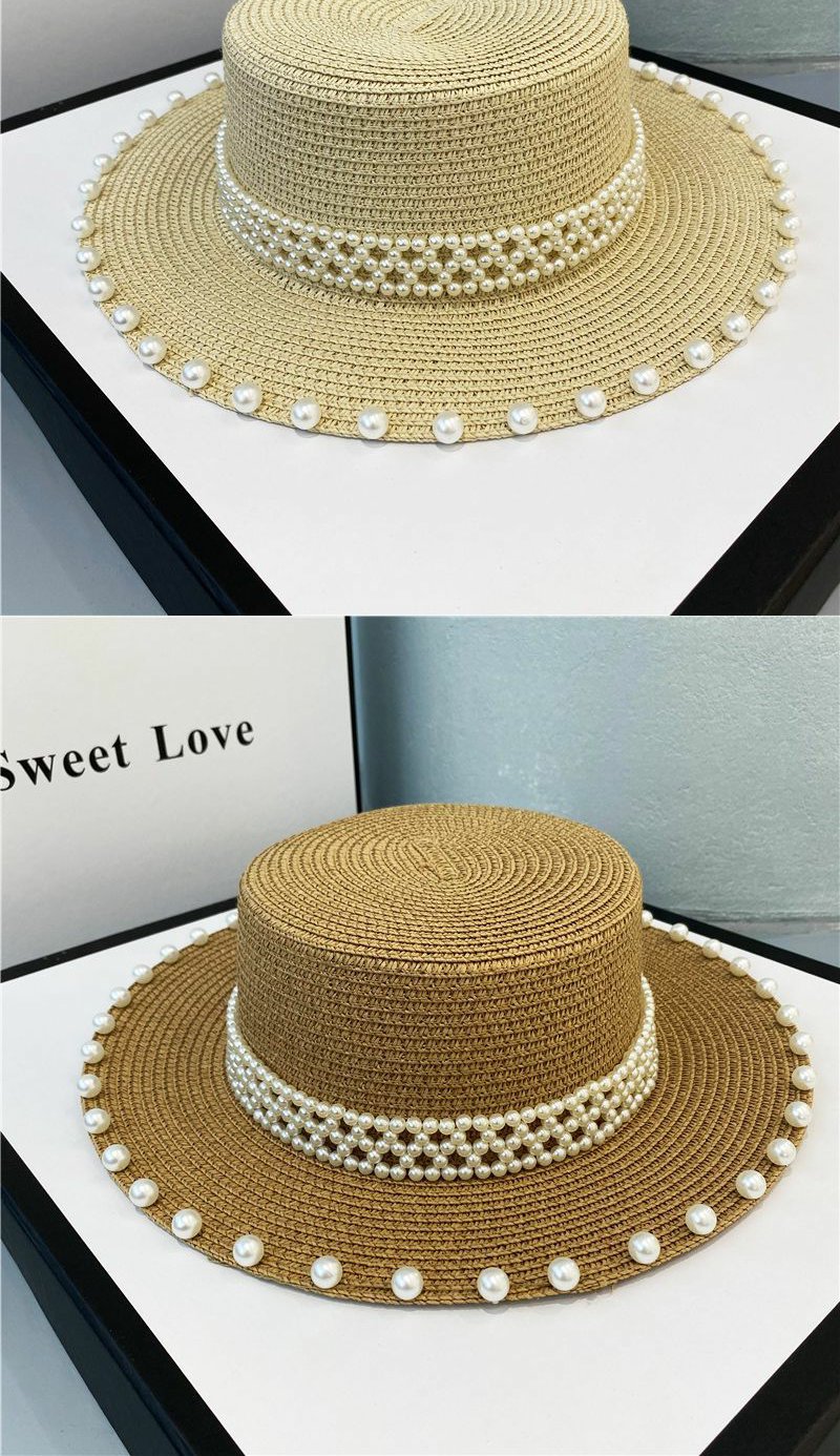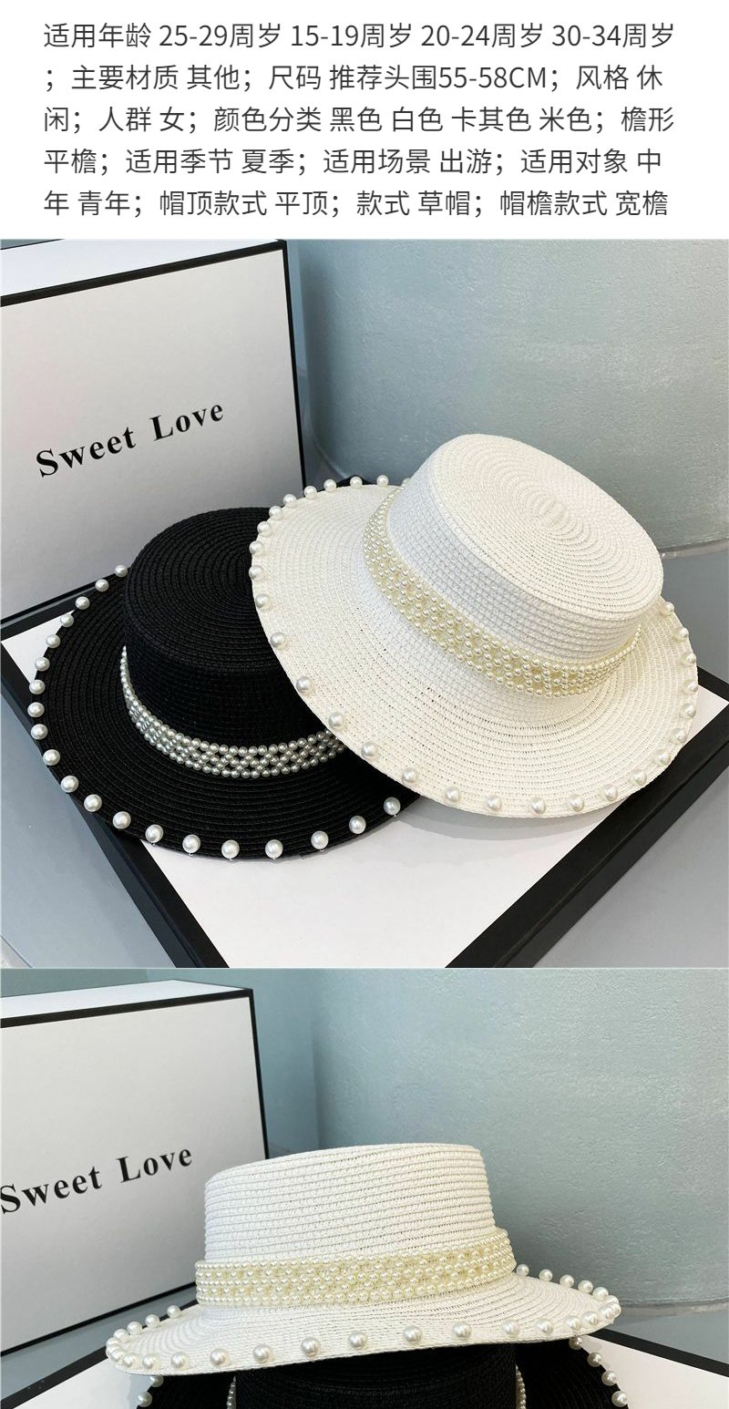 赫本风帽子海边珍珠草编草帽遮阳帽复古网红平顶礼帽