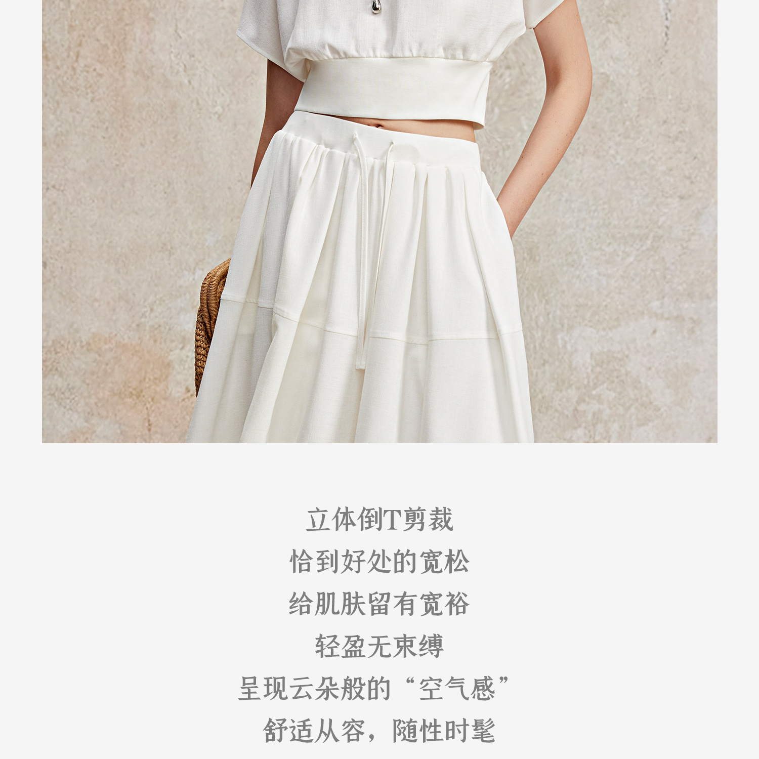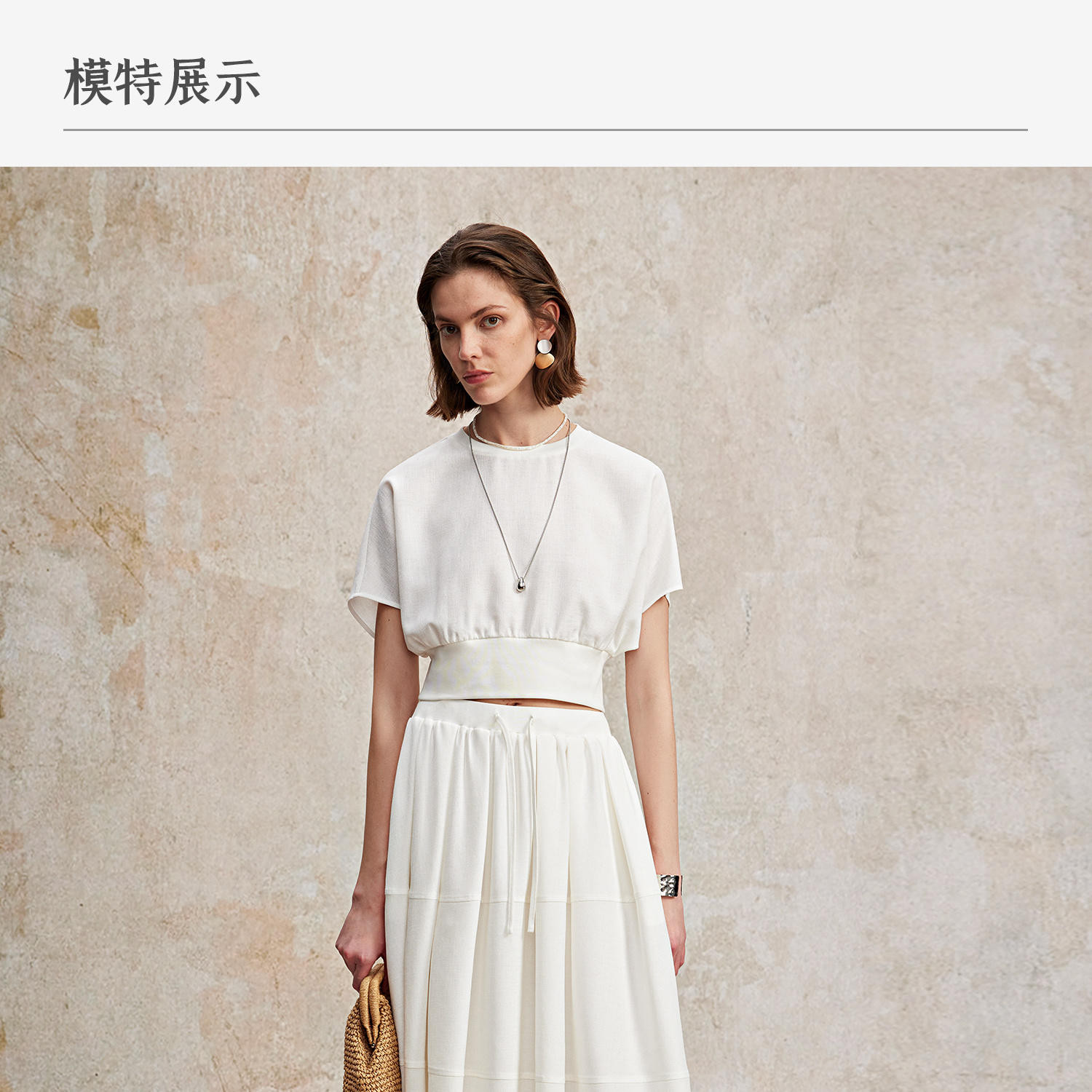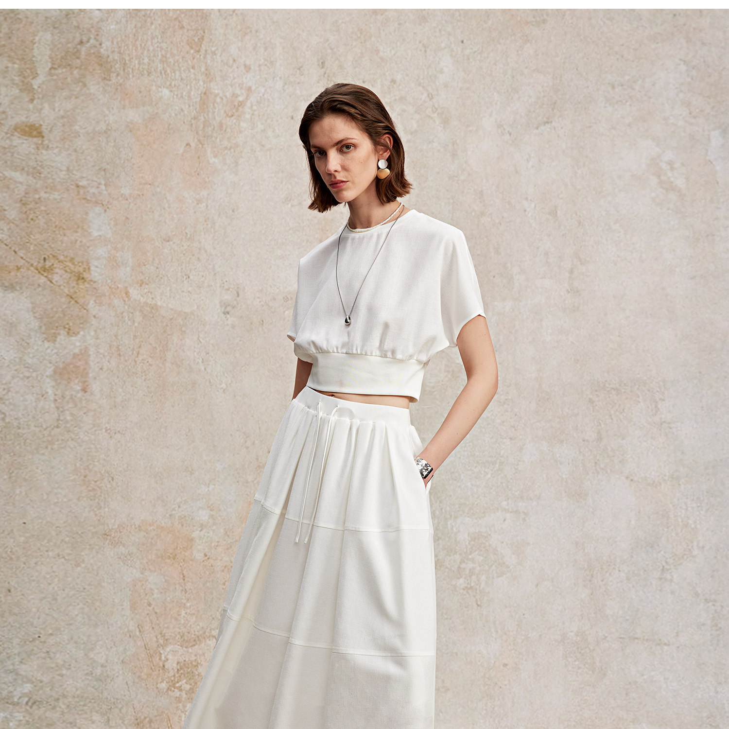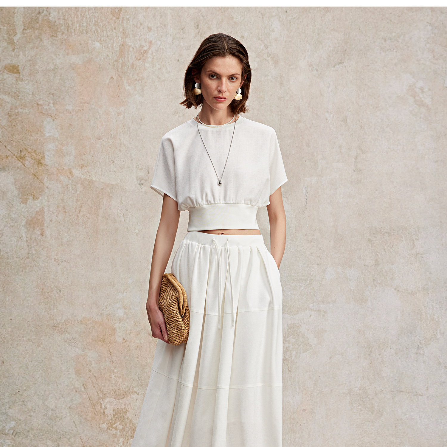 南法假日醋酸仿麻拼接罗纹简约短上衣/分割设计伞裙2025夏T2502018