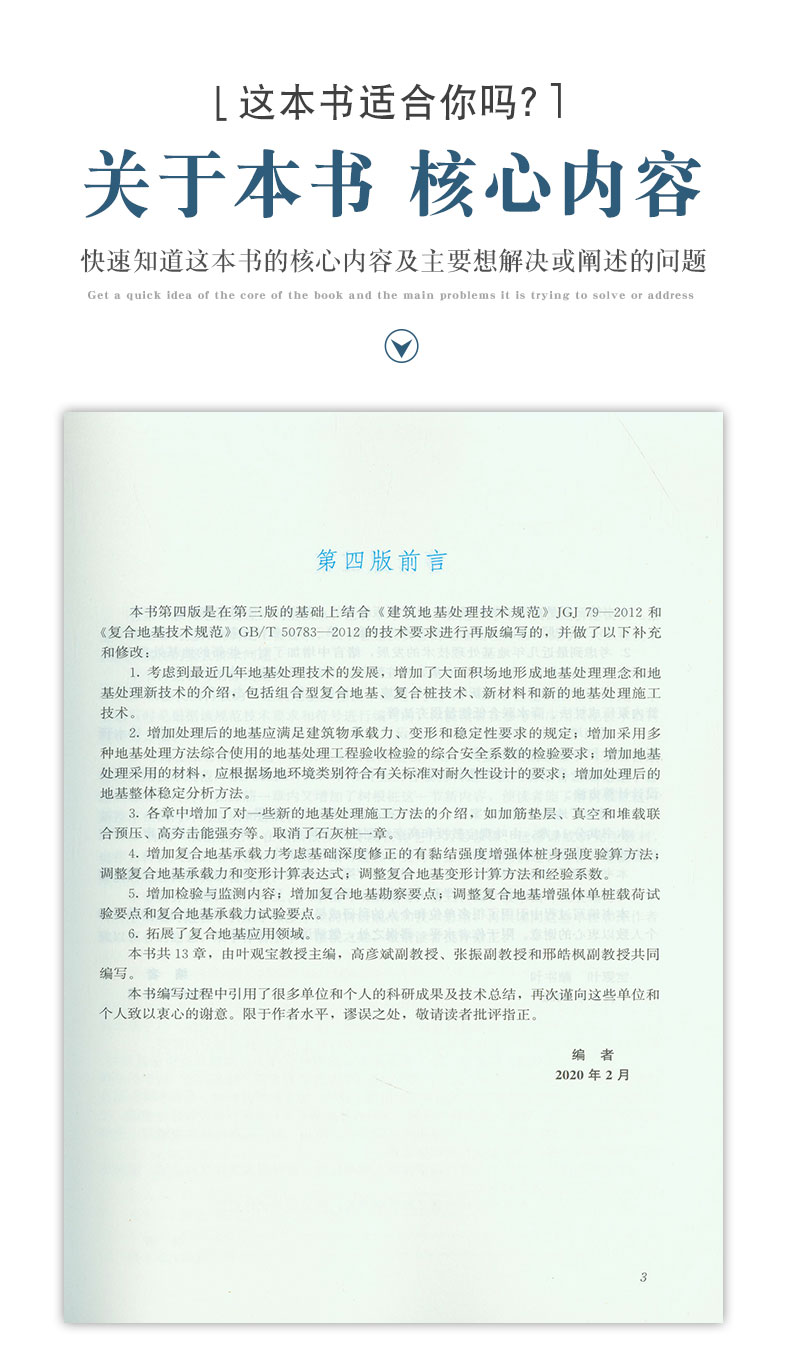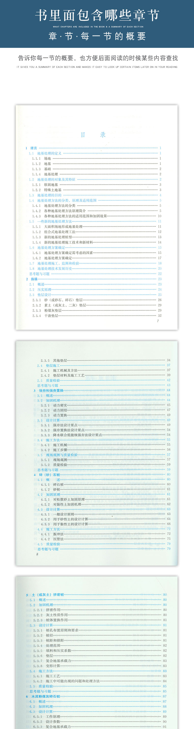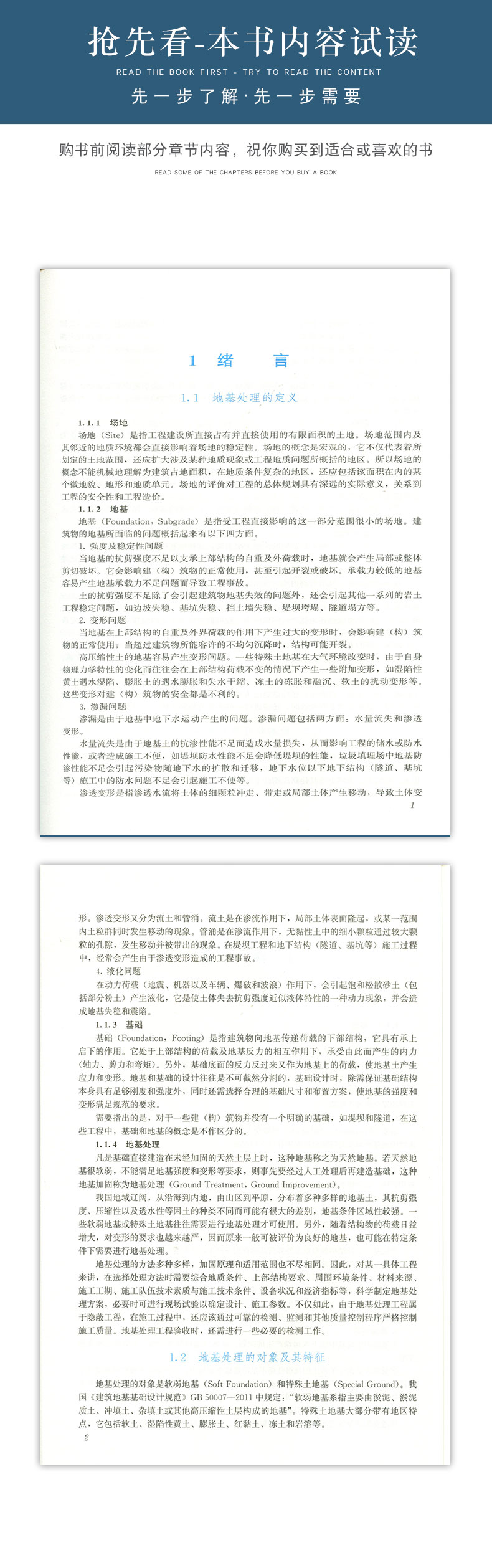 本书结合《建筑地基处理技术规范》JGJ79-2012和《复合地基技术规范》GB/T50783-2012的技术要求,详细介绍了当前国内外各种地基处理技术的概念、加固机理、设计计算、施工工艺和质量检验等内容等。这些地基处理方法包括:砂(或砂石、碎石)垫层、素土(或灰土、二灰)垫层、粉煤灰垫层、干渣垫层、加筋垫层、轻质材料垫层(EPS垫层)、强夯和强夯置换、碎(砂)石桩、土(或灰土)桩、水泥粉煤灰碎石桩、堆载预压、真空预压、灌浆、水泥土搅拌桩、高压喷射注浆、土工合成材料、加筋土挡墙。书中还对复合地基的理论和设计进行了系统的阐述。 本书可作为土木工程、地质工程、港口与航道工程等专业学生的教材,也可供以上专业从事勘察、设计、施工、监理的技术人员作参考资料。