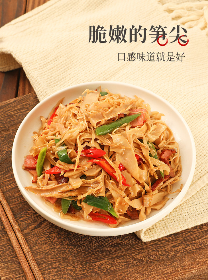 糯米笋脆嫩爽口的质感,无论炒、炖、焖、煨皆成美味,鲜到极点的口味无论和肉、海鲜亦或是其它食材搭配,都游刃有余、从容不迫。 最关键的是,这是一包实实在在的“方便菜”,忙了一天,回来不想做饭的姐妹们,叫外面又怕不卫生。不必纠结,糯米笋的出现,拯救了你的烦恼。 不用泡,不用切,倒油下锅炒菜只需三分钟,无需等待,节省做饭时间的同时还能快速解决饥饿问题,方便菜果然名副其实。