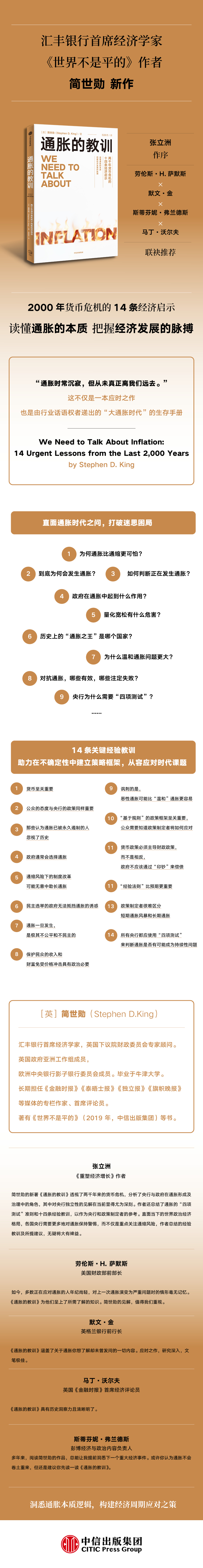 书中开篇介绍了当前全球的通胀形势;接着,深入探讨了通胀的历史及其与货币的关系、通胀所产生的非民主影响,以及消除通胀面临的重重困难;随后,作者仔细剖析了相关政策的失败案例,并提出央行等政策制定者理论上应该采用的“四项测试”;后,总结了从2000年的历史中汲取的14条紧迫的教训,并就未来如何更好地管理通胀风险给出了建议。