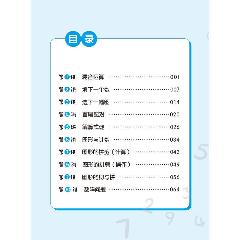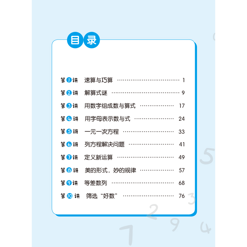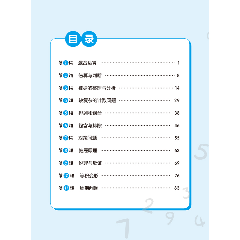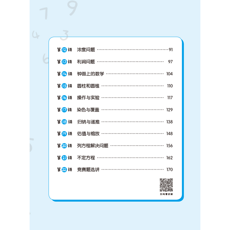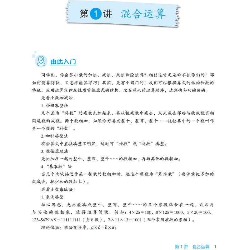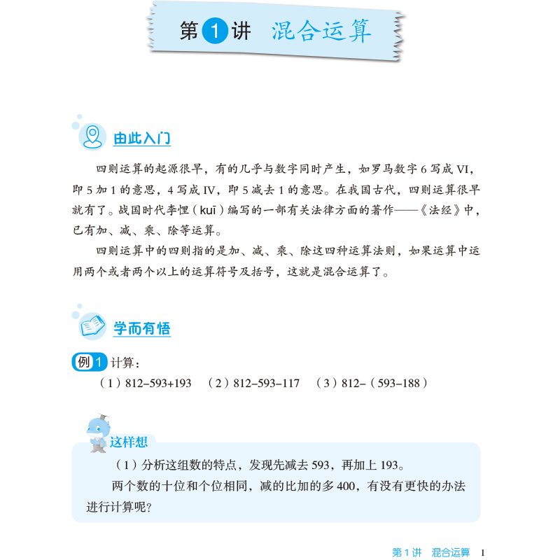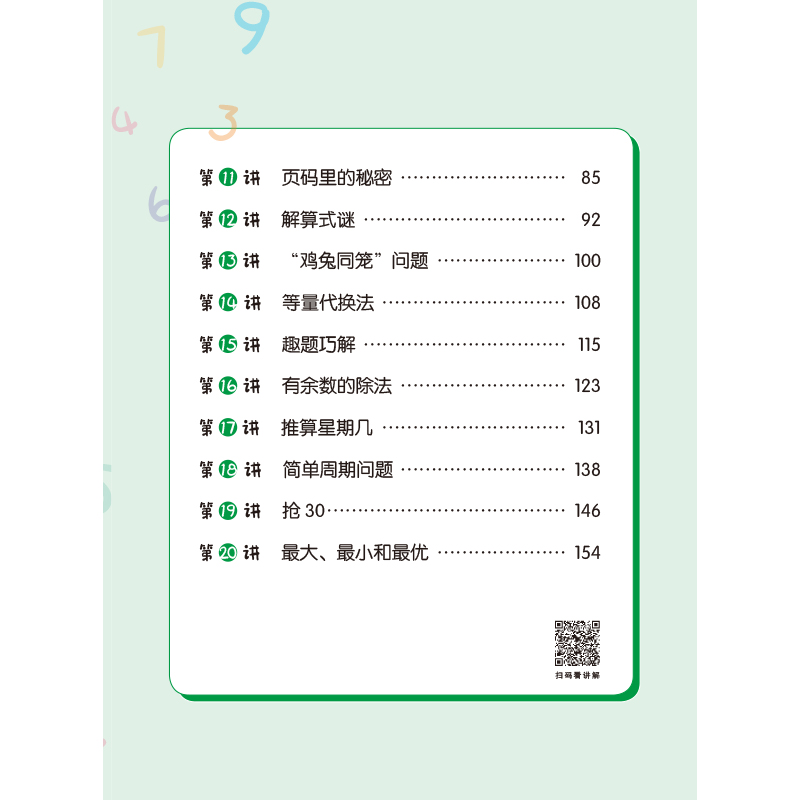 每个年级设20-22讲,讲练结合。每讲的“由此入门”栏目通过情境化的内容导入专题,引导小读者自动而自然地进入探究与思考的积极状态;每讲精选4-7道典型例题,通过“这样想”栏目,详细解析例题的思考过程,关注思维起点,突出已知与未知的因果关联;每道例题的后紧跟1个练习,每一讲后有“小试身手”,引导小读者自主测试与评价,同时配二维码为小读者提供重难点和易错题目的答案与讲解;“回味一番”栏目引导小读者在回味、反思、比较中学会关联、发现规律、掌握方法。