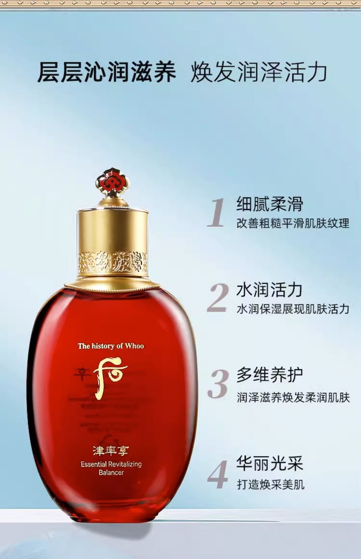 👑WHOO后津率享爽肤水150ml 23版 🎀维持女性肌肤健康的红参液等成分✨ 💎均匀调理肌肤,激活肌肤能量,控制水油平衡 💦净化紧肤,蛋清质地,滋润不粘腻,迅速被皮肤吸收 💙使肌肤丰润柔嫩,持久保湿滋润💦 ✅有效:细腻柔滑、水润活力、多维养护、华丽光采✔️ 💖津率享系列:比较适合30岁以上的熟龄肌使用,适合干性和混干性肌肤