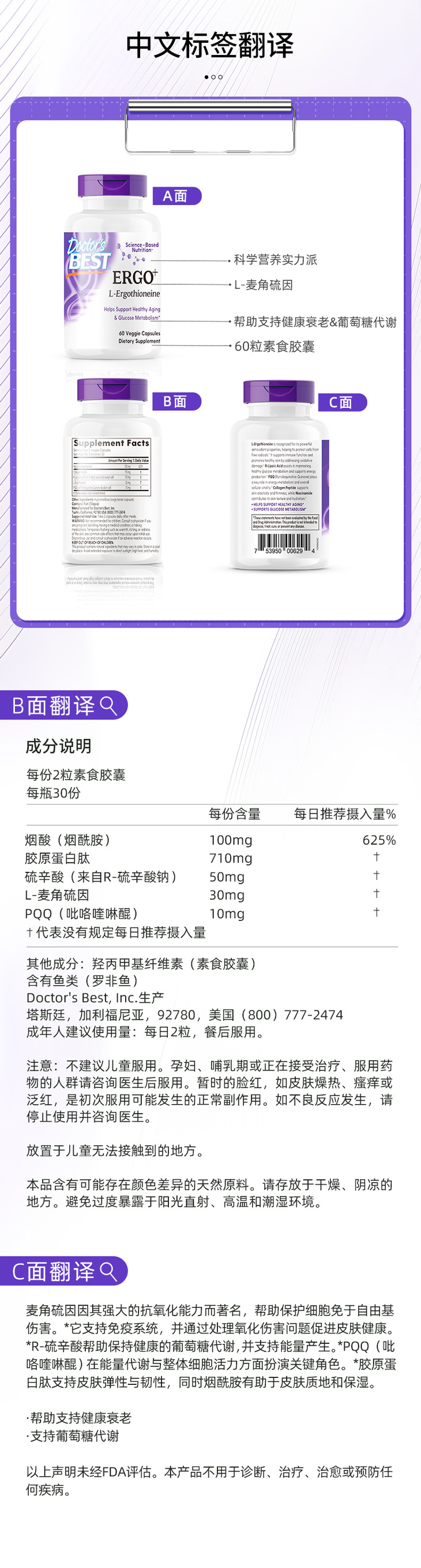 麦角硫因|30mg补充线粒体 抗老抗衰 60粒(每日2粒)Doctor's Best 麦角硫因素食硬胶囊