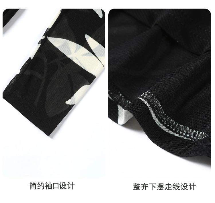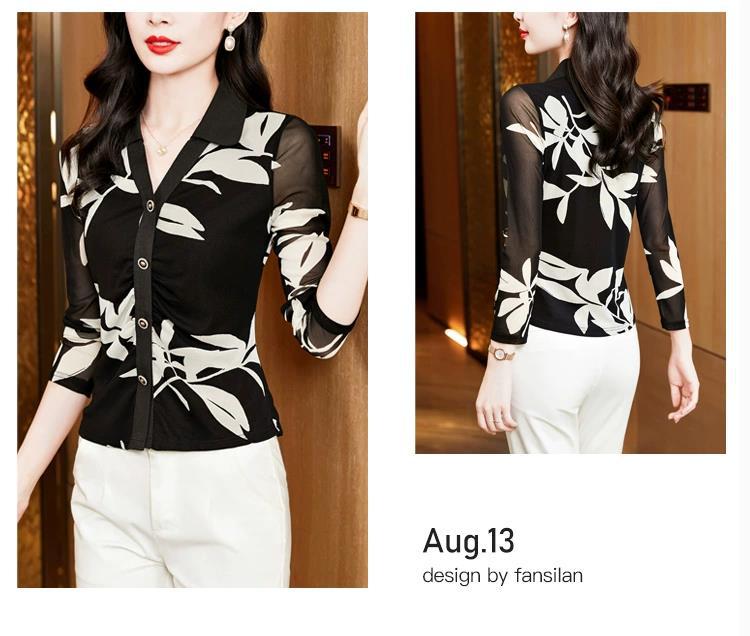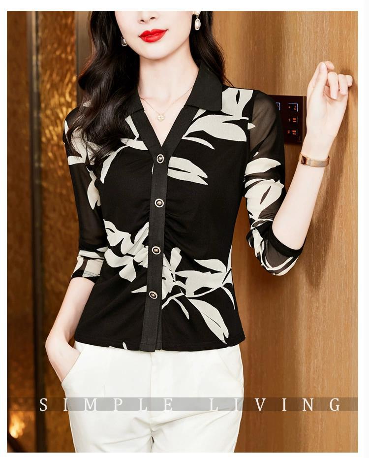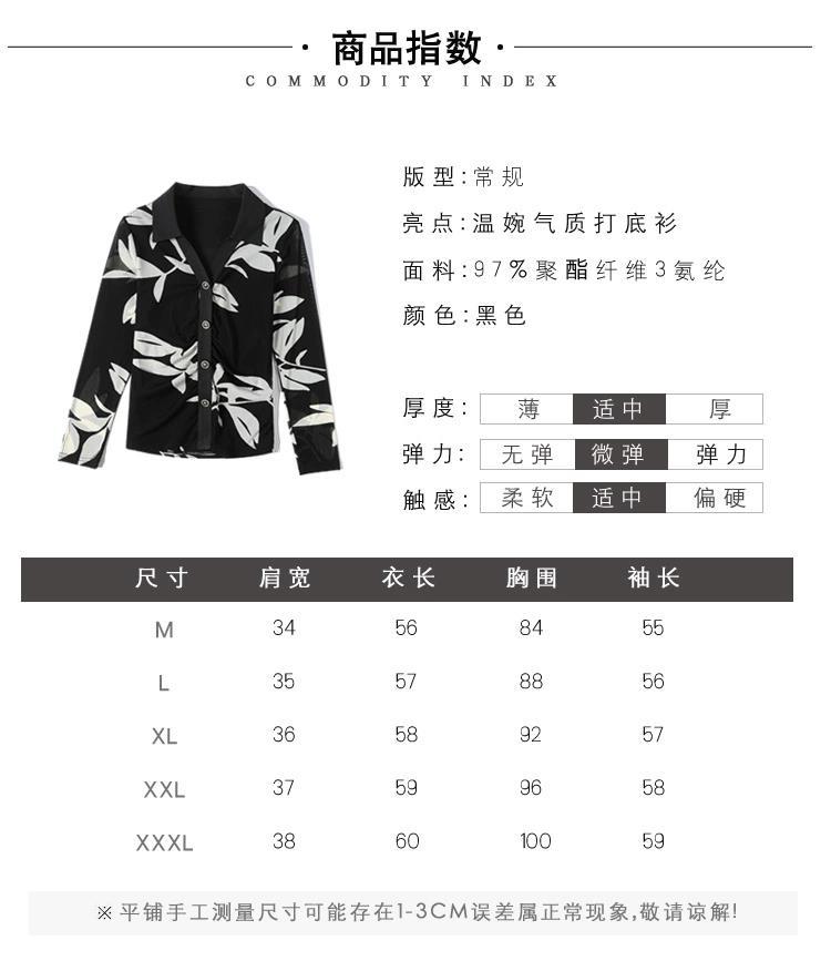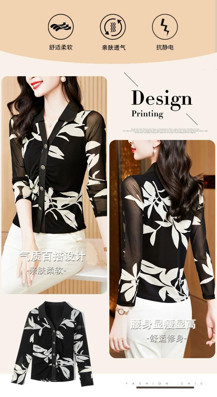 雀说 春秋季印花网纱打底衫女衬衫洋气时尚独特显瘦收腰上衣4ZF-021911