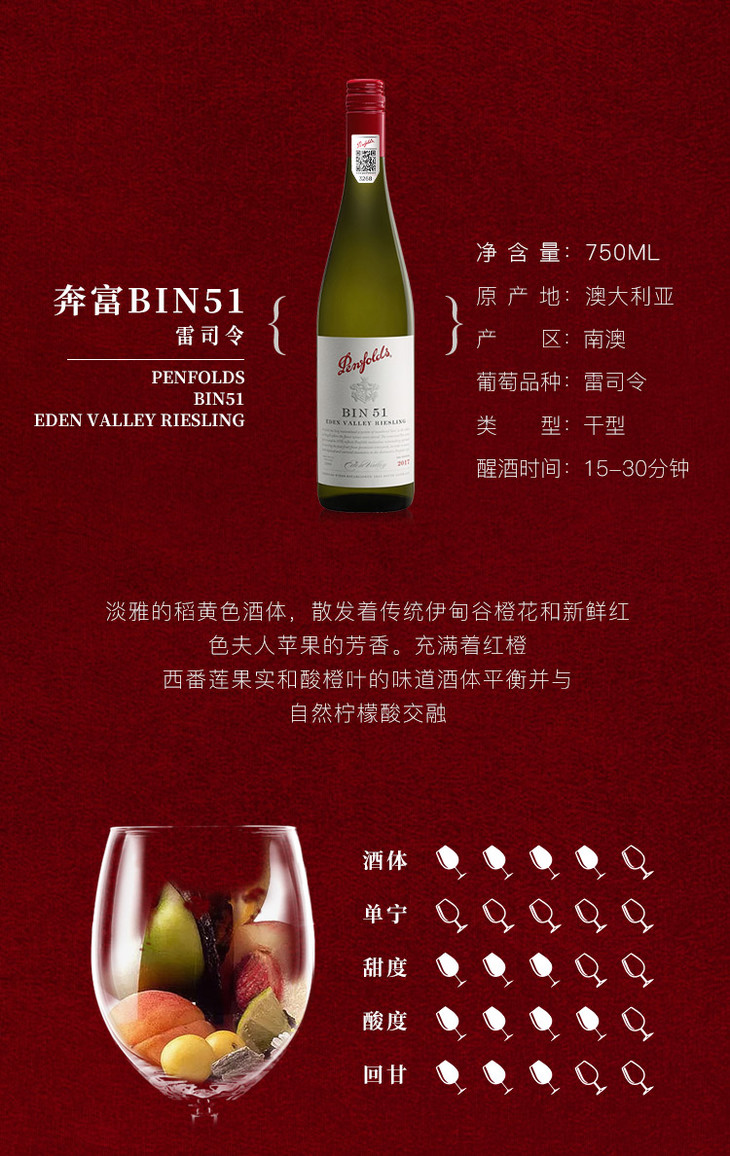 奔富(Penfolds)BIN51伊顿谷雷司令白葡萄酒(1箱6瓶装)