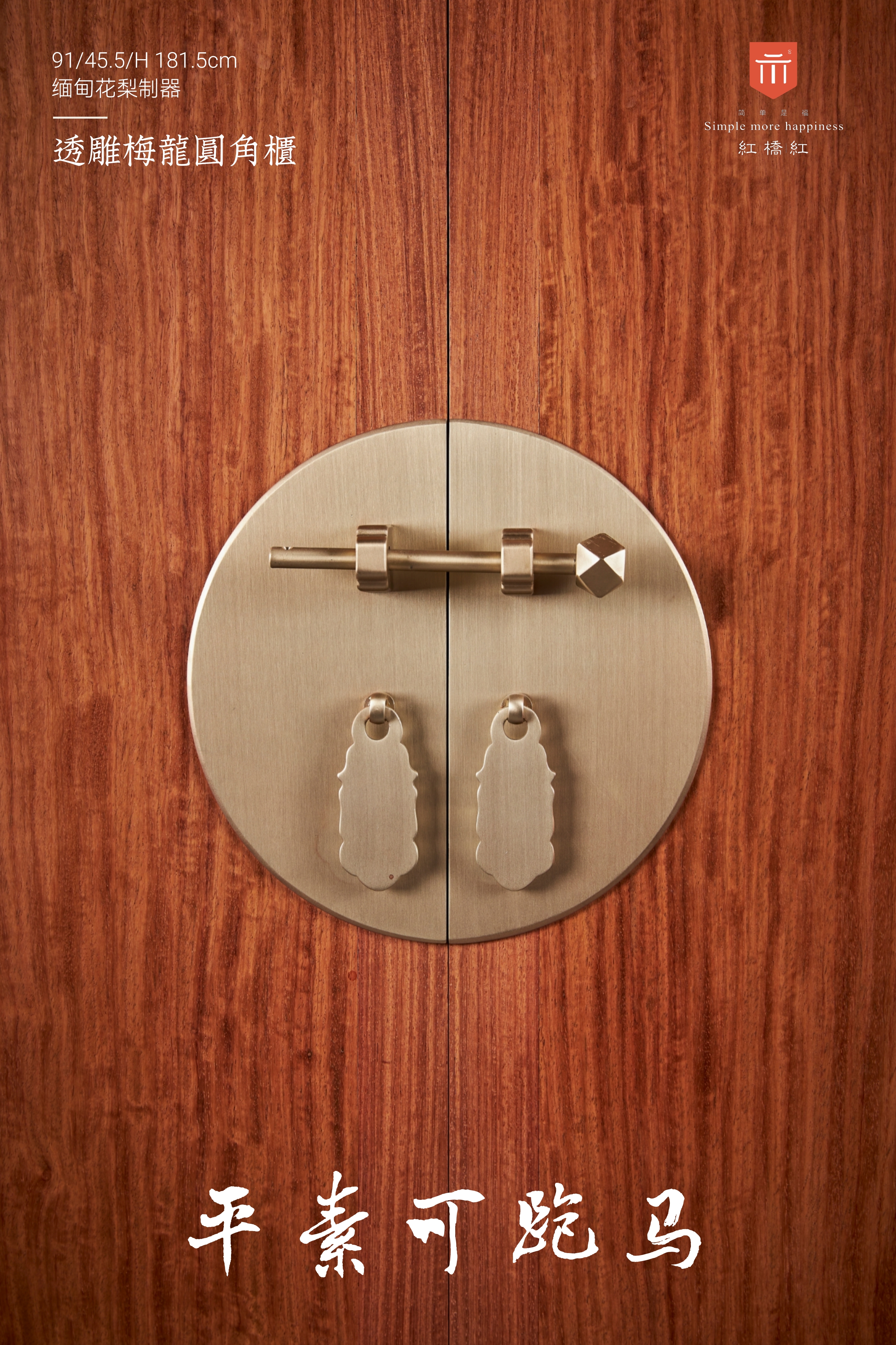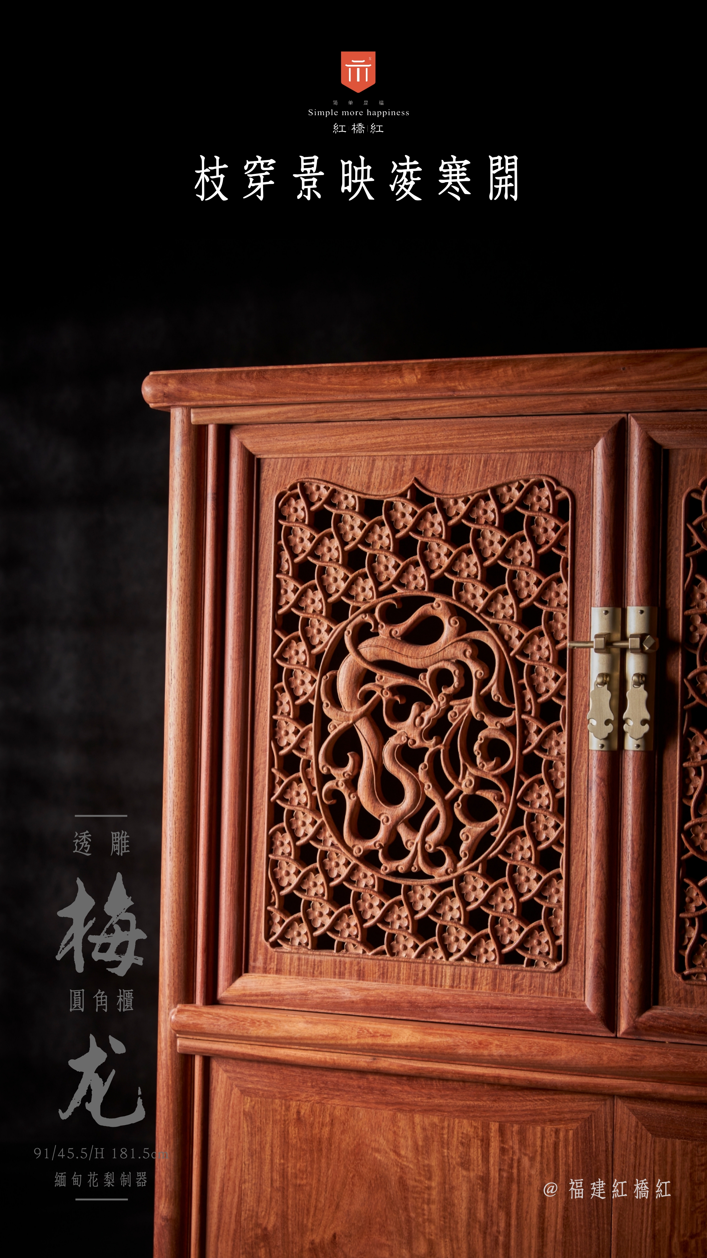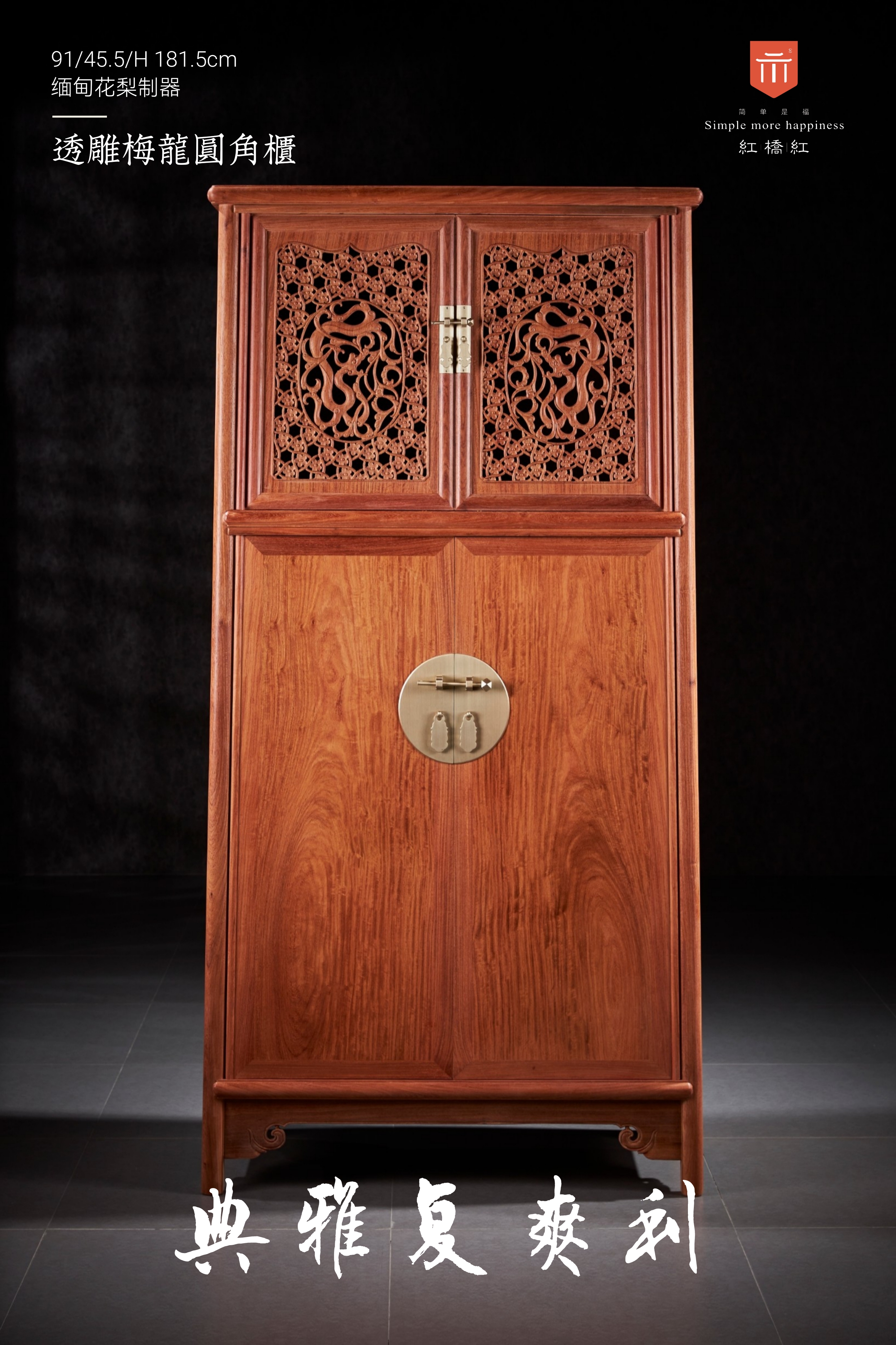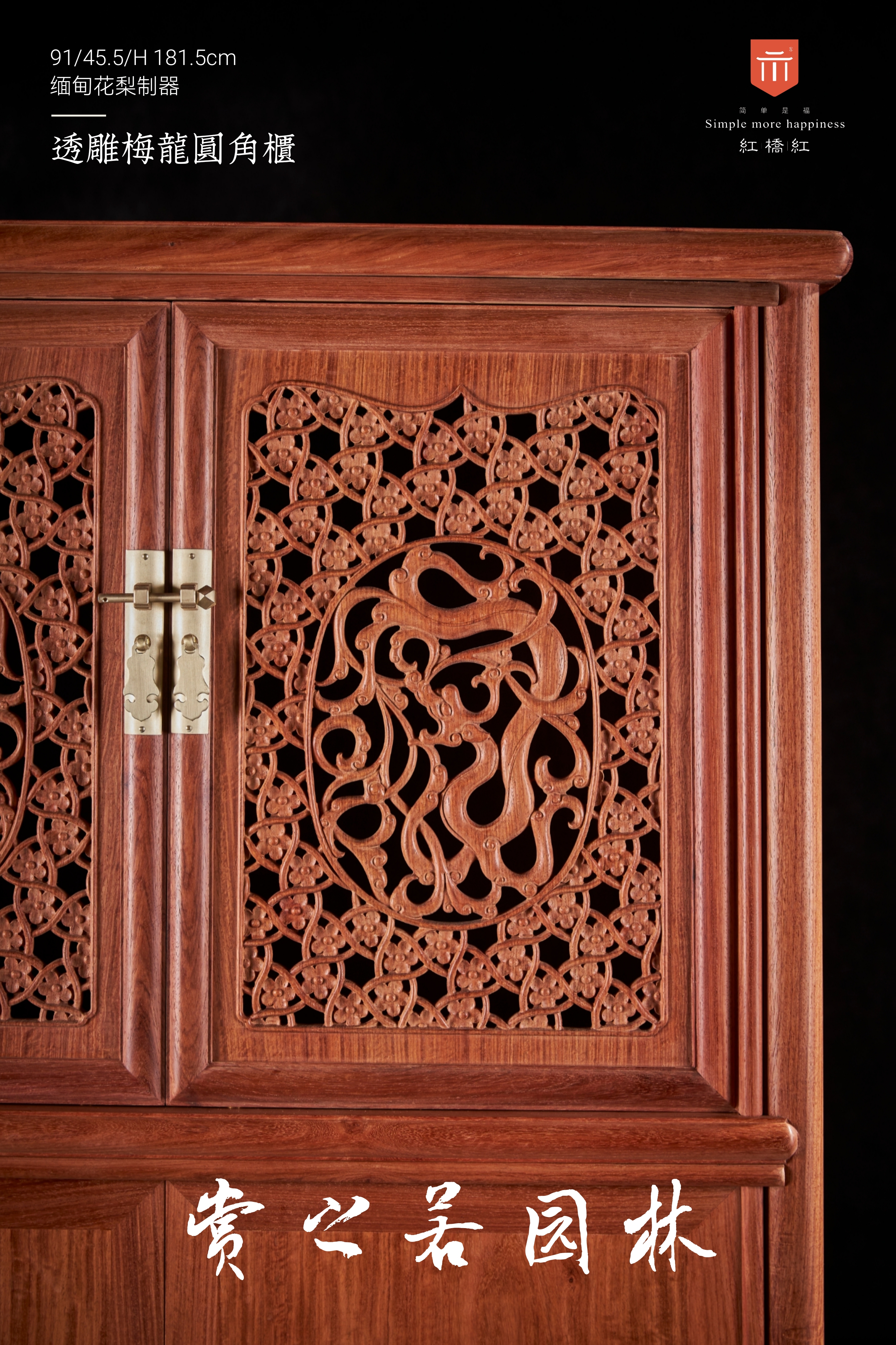 这款圆角柜原型来自伍炳亮款,一件明式黄花梨梅花草龙纹圆角柜,收录于《伍丙亮作品珍赏》P259。