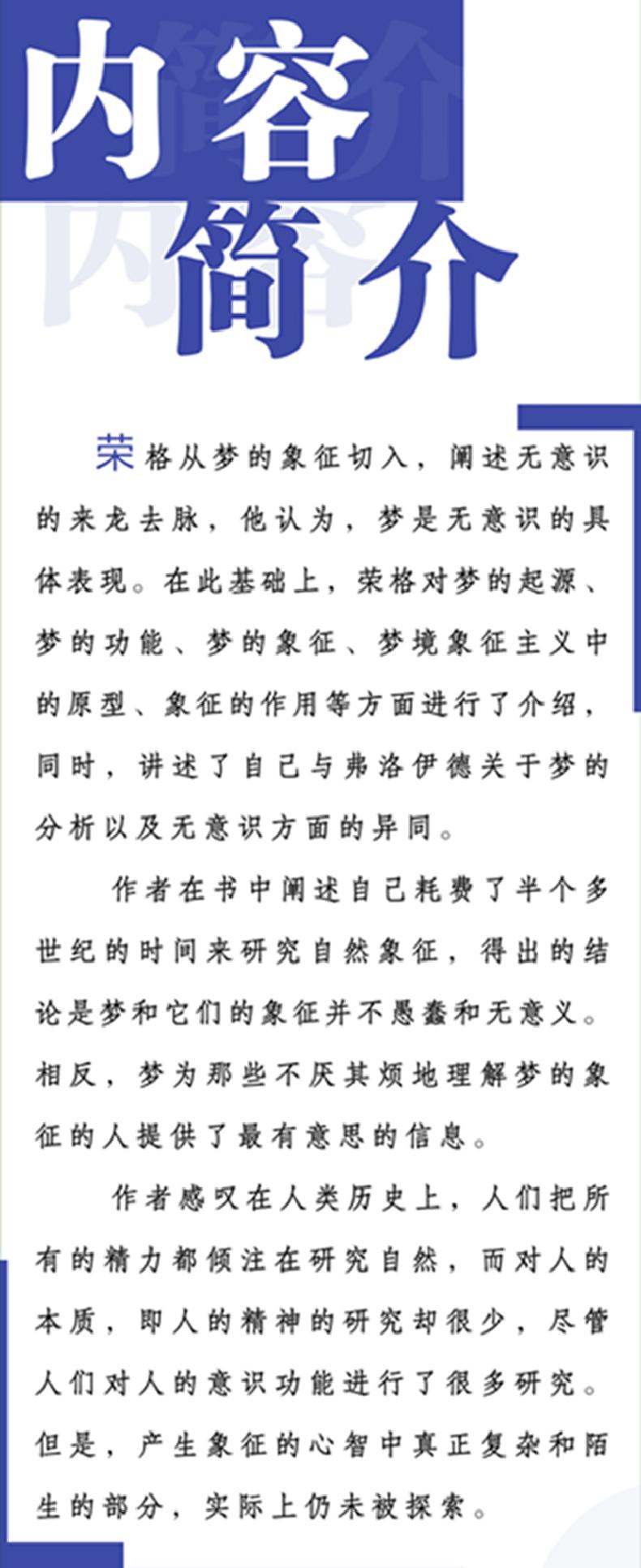 荣格从梦的象征切入,阐述无意识的来龙去脉,他认为,梦是无意识的具体表现。在此基础上,荣格对梦的起源、梦的功能、梦的象征、梦境象征主义中的原型、象征的作用等方面进行了介绍,同时,讲述了自己与弗洛伊德关于梦的分析以及无意识方面的异同。