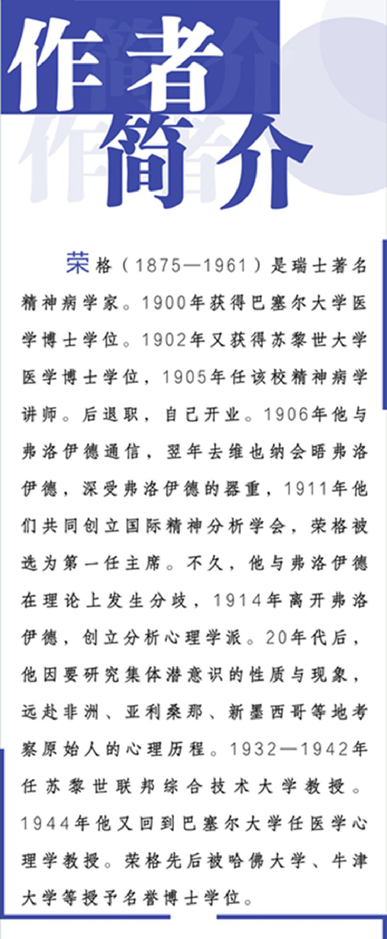 荣格(1875—1961)是瑞士著名精神病学家。1900年获得巴塞尔大学医学博士学位。1902年又获得苏黎世大学医学博士学位,1905年任该校精神病学讲师。后退职,自己开业。1906年他与弗洛伊德通信,翌年去维也纳会晤弗洛伊德,深受弗洛伊德的器重,1911年他们共同创立国际精神分析学会,荣格被选为一任主席。不久与弗洛伊德在理论上发生分歧,1914年他离开弗洛伊德,创立分析心理学派。20年代后,他因要研究集体潜意识的性质与现象,远赴非洲、亚利桑那、新墨西哥等地考察原始人的心理历程。1932—1942年任苏黎世联邦综合技术大学教授。1944年他又回到巴塞尔大学任医学心理学教授。先后被哈佛大学、牛津大学等授予名誉博士学位。
