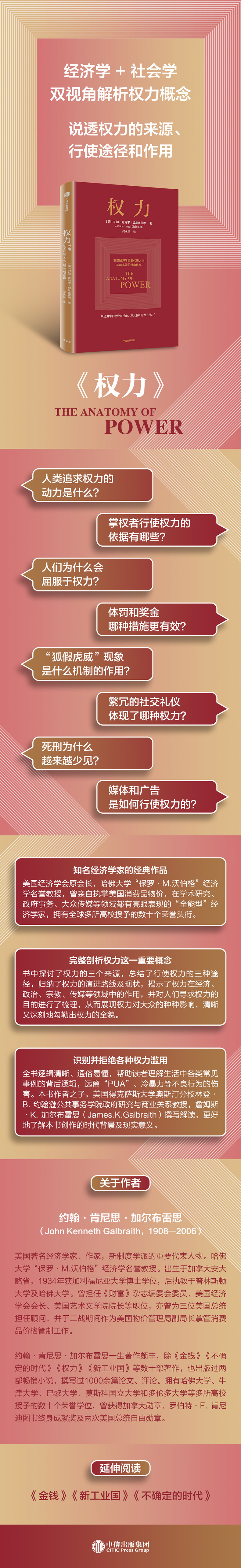 约翰·肯尼思·加尔布雷思一生著作颇丰,除《金钱》《不确定的时代》《权力》《新工业国》等数十部著作,也出版过两部畅销小说,撰写过1000余篇论文、评论。拥有哈佛大学、牛津大学、巴黎大学、莫斯科国立大学和多伦多大学等多所高校授予的数十个荣誉学位,曾获得加拿大勋章、罗伯特·F. 肯尼迪图书终身成就奖,两次获得美国总统自由勋章。