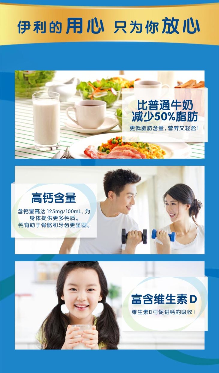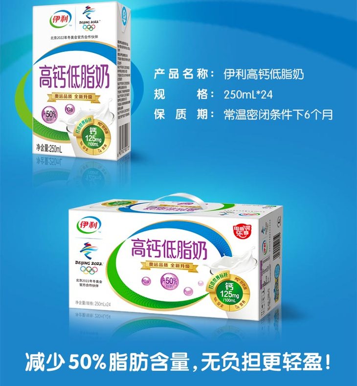 伊利高钙低脂牛奶、高钙牛奶、脱脂牛奶250ml*24盒