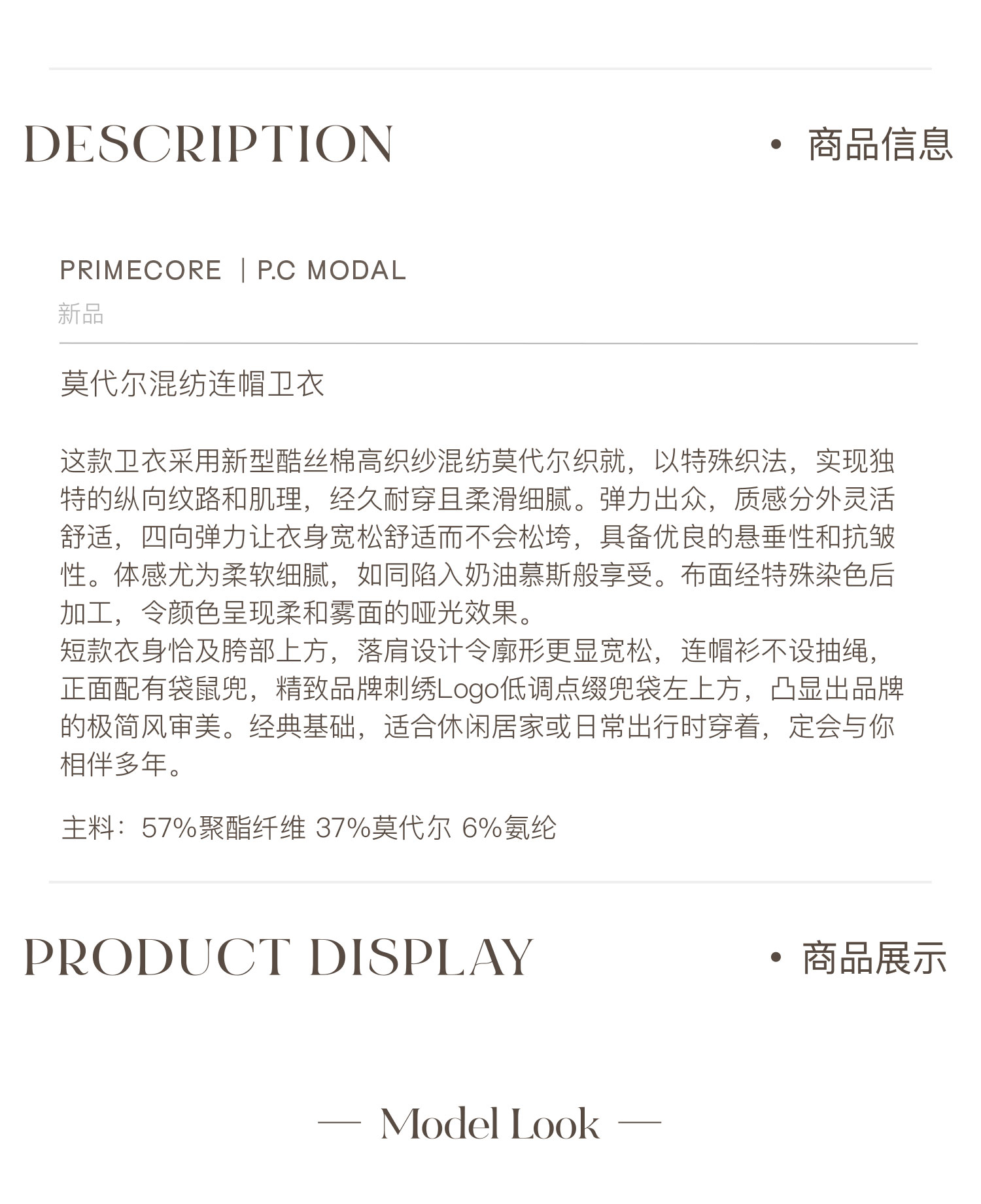 PRIMECORE 莫代尔混纺连帽卫衣运动长袖纯色百搭休闲通勤