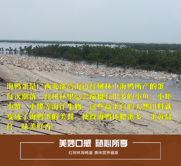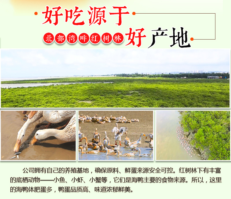 海鸭蛋,海鸭所产之蛋。我们的海鸭生活在北部湾沿海滩涂红树林中,以鱼、虾、贝类等海生物为食,所产的海鸭蛋蛋黄晶红,营养丰富。