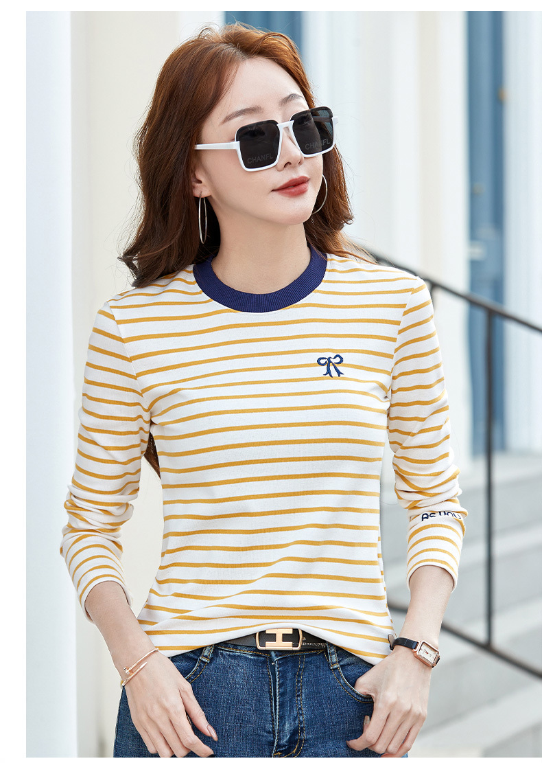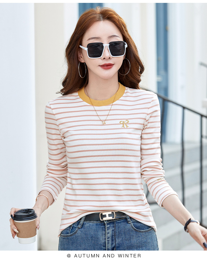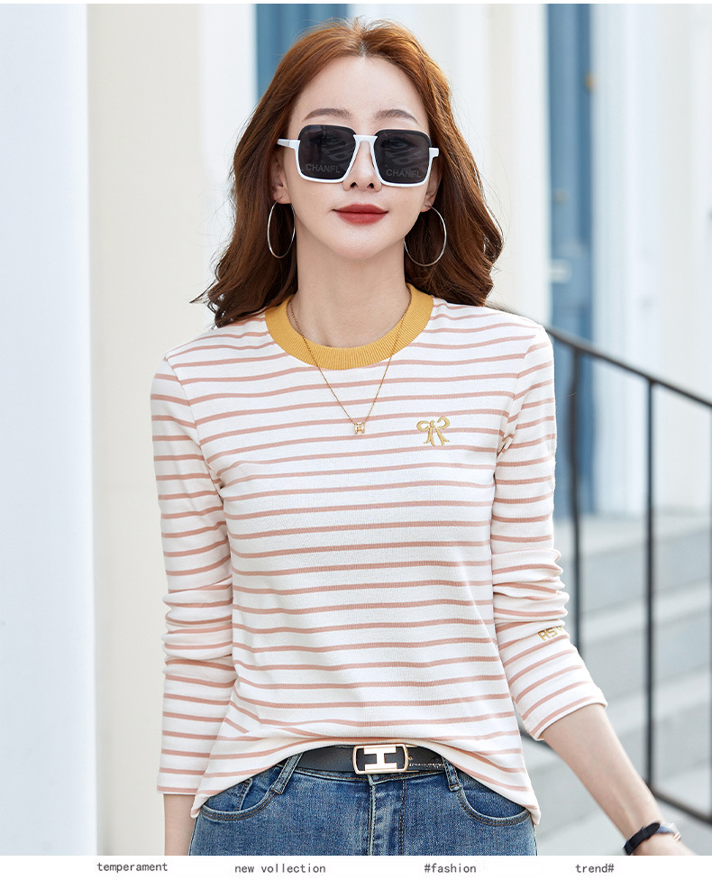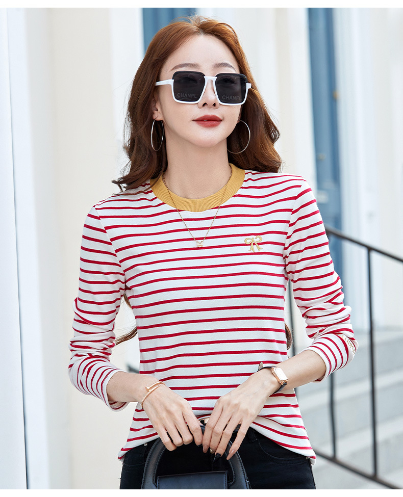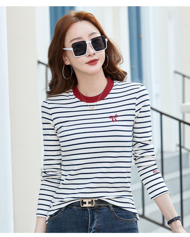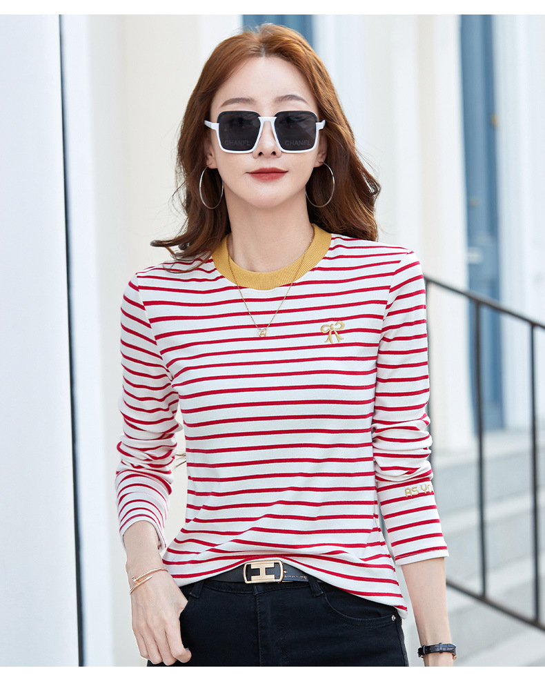 百媚生 棉质条纹针织衫女蝴蝶刺绣上衣482