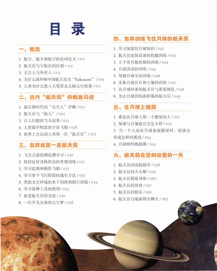 本书图文并茂,语言通俗易懂。近日,《全民科学素质行动规划纲要(2021-2035年)》正式发布,本书的出版不仅是国家中长远规划的科学普及需要,更是为广大科普爱好者解惑答疑,提升广大青少年科学文化素质的需要。本书既可以作为了解太空探索和航天员方面知识的辅助阅读,也可以让读者迅速地获取大量关于航天方面的知识信息,适合所有年龄段的读者阅读。