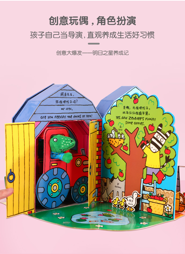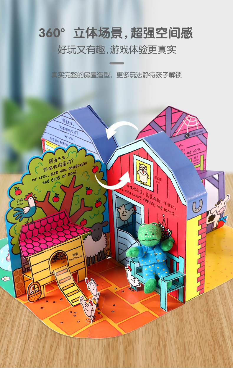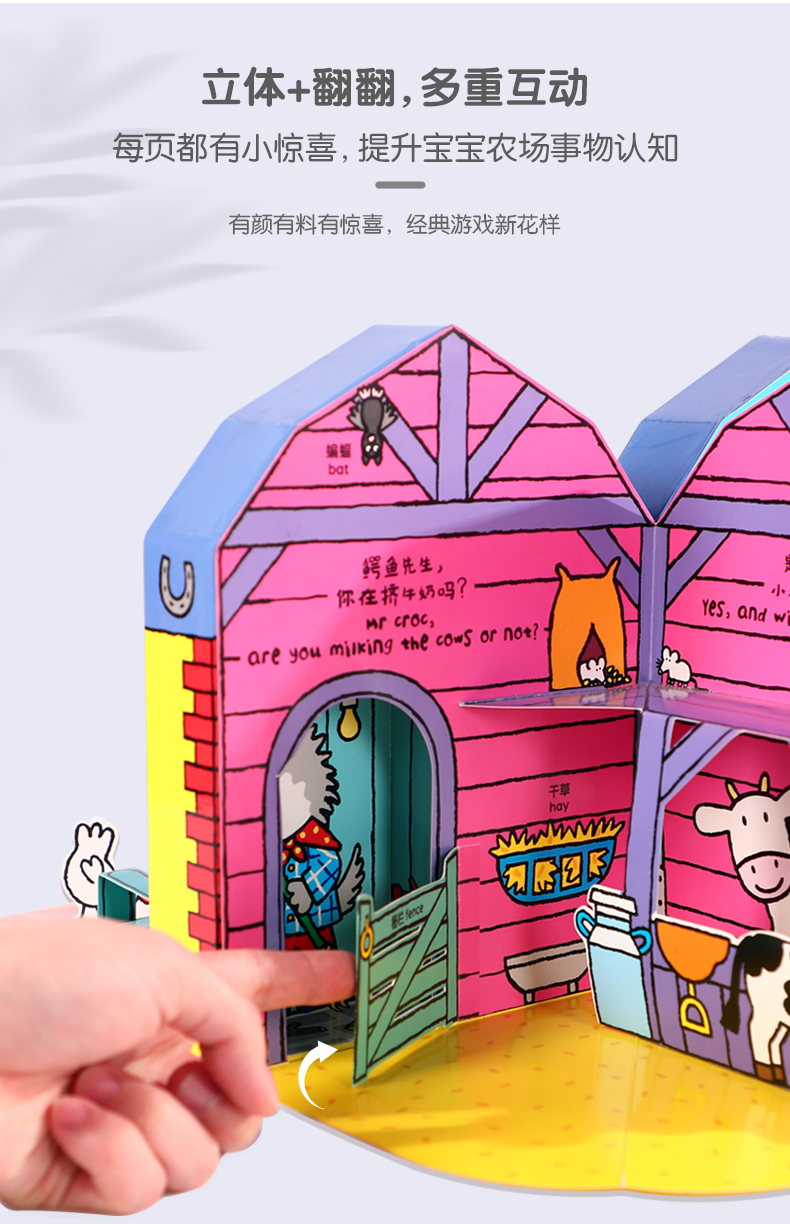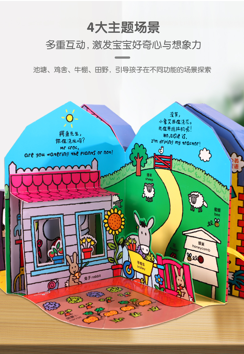 2. 这本书打开就会变成立体的农场。4个场景,还有纸偶拖拉机和丰富的游戏道具。