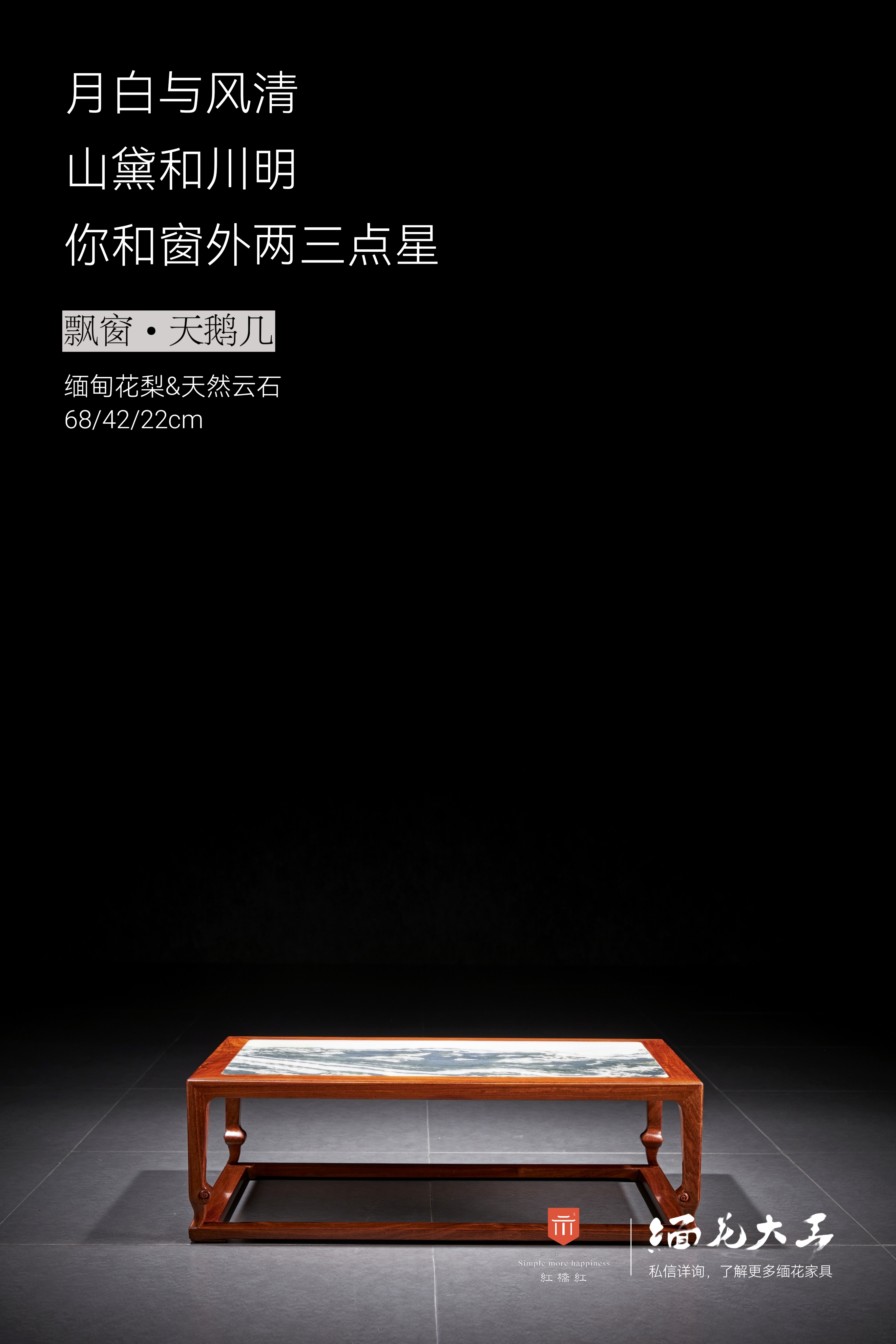 炕几器型源于传统无束腰榻类。几面攒框平嵌一块云石,白质黑章,泼墨写意,每件必不同。底部设两根穿带,带托泥与面框呼应,亦可对小几受力进行分散。
