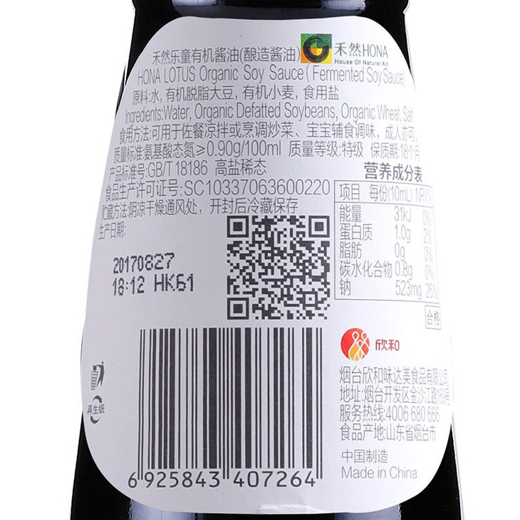禾然有机系列是中国第一个有机调味品品牌,看LOGO就是4个春夏秋冬大地色,流露出师法自然的理念,全系列产品均获得有机认证:1、禾然有机酱油是品牌系列创办时至今的拳头产品,酱香浓郁无杂味;2、禾然乐童有机酱油盐含量低,是国产酱油盐含量最低系列。