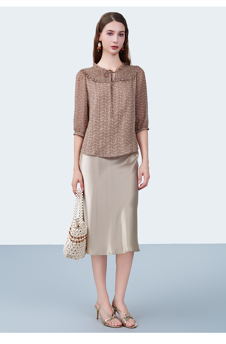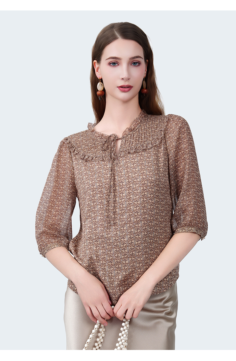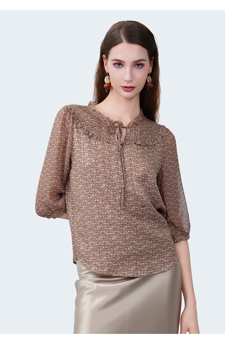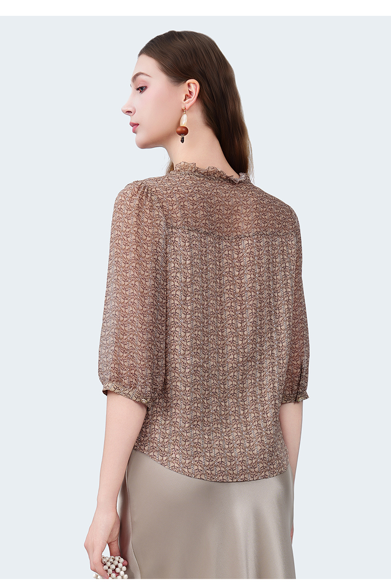 乔万尼新品中袖印花南法田园风木耳领100%真丝衬衫上衣ED2C437